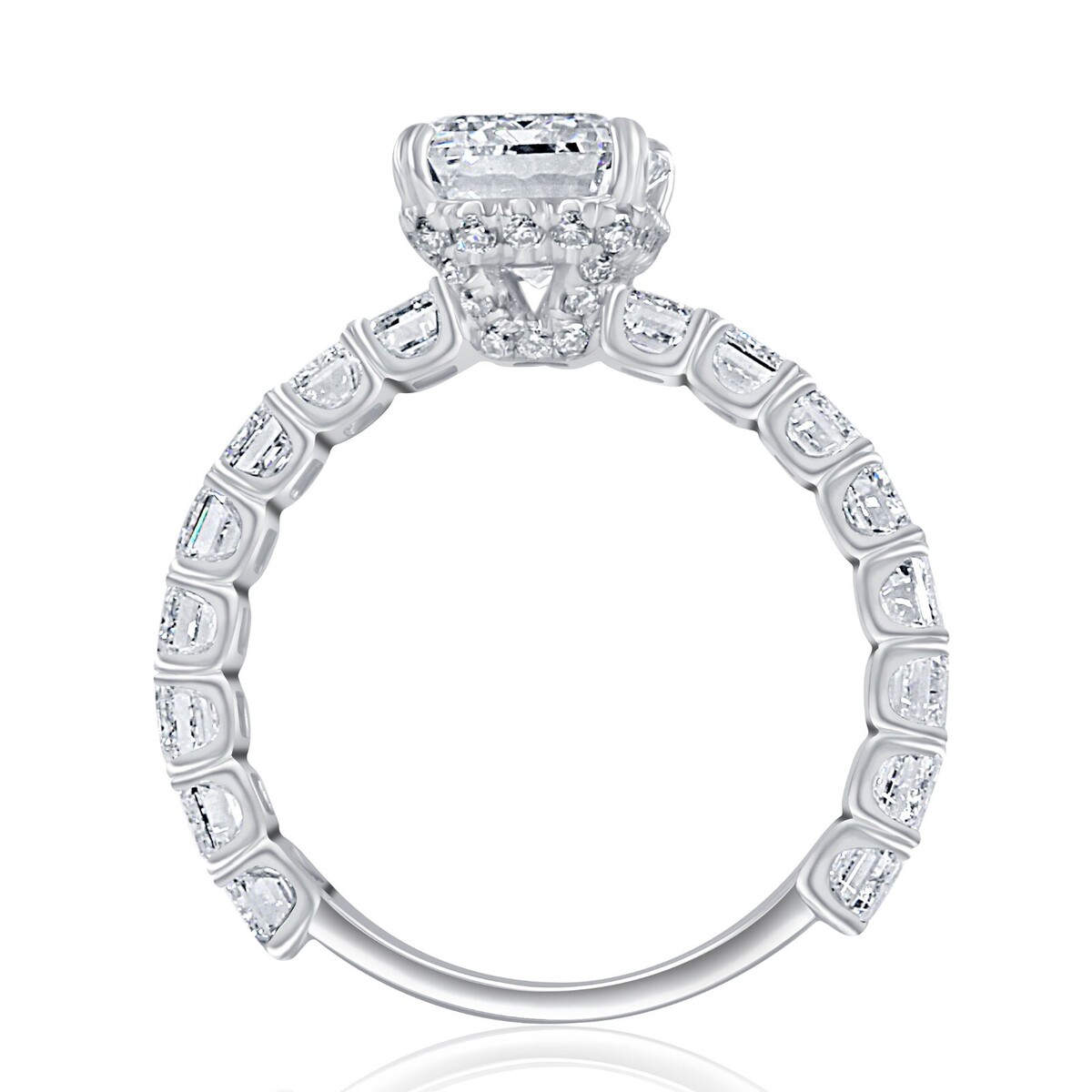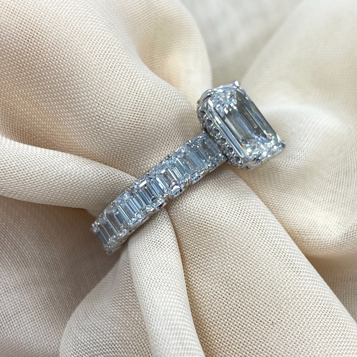 Faites une declaration audacieuse avec cette magnifique bague de fiancailles en diamant de laboratoire taille emeraude. Fabriquee en or blanc brillant 18 carats, cette bague presente une piece maîtresse epoustouflante : un diamant cultive en laboratoire de couleur E VVS2 Clarity de 3,05 carats avec une taille emeraude. Le design en forme de halo cache ajoute a l'attrait de la bague, où de petits diamants ronds sont sertis sous la pierre centrale pour creer l'illusion d'un diamant plus gros. Le groupe comporte des diamants emeraude cultives en laboratoire sertis dans un style eternite, symbolisant l'amour et l'engagement sans fin entre vous et votre partenaire. Le poids total en carats est de 6,38 carats. Nos produits sont tous fabriques a la main avec qualite et soin, au c?ur du quartier d