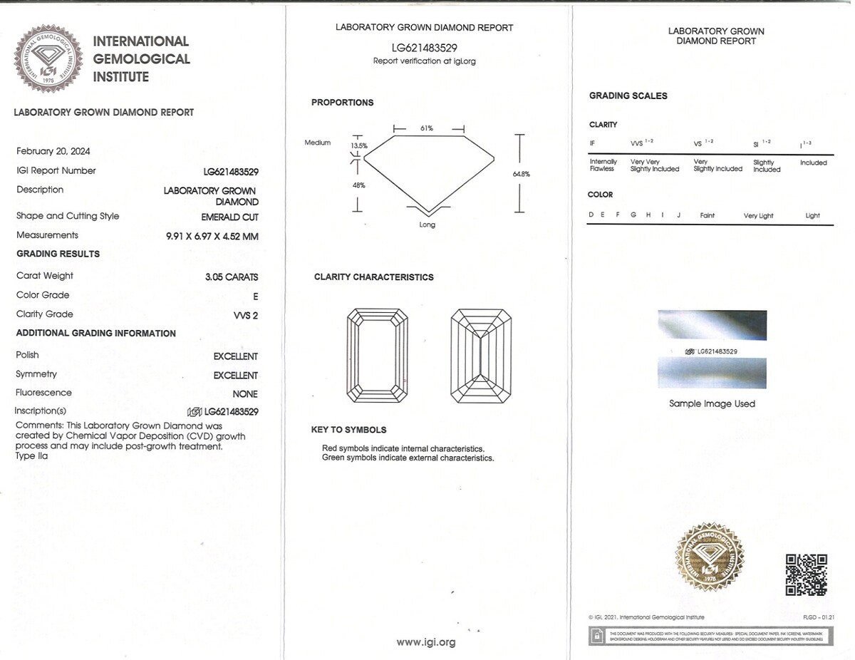 Fiancailles Bague Igi 3.05 CT E-VVS2 Emeraude Coupe Labo Grown Diamant 18K 6.38