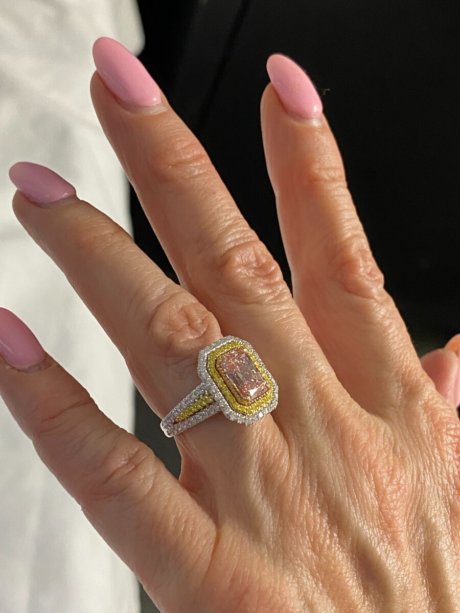 Este excepcional anillo exhibe un impresionante diamante cultivado en laboratorio de talla radiante de color rosa intenso y elegante con certificacion IGI de 2,06 quilates, rodeado por un lujoso halo doble de diamantes elegantes de color amarillo intenso e incoloros. El arte continúa con diamantes adicionales engastados a lo largo de la galería y el cuerpo dividido, acentuados por diamantes amarillos de talla redonda ubicados entre ellos. Elaborada a mano en oro multitono de 14k, esta obra maestra irradia elegancia vibrante, lo que la convierte en un tesoro verdaderamente único. Todos nuestros productos estan hechos a mano con calidad y cuidado, en el corazon del distrito de los diamantes en la calle 47 de la ciudad de Nueva York. Nuestra dedicacion y compromiso con el buen trabajo y la ca