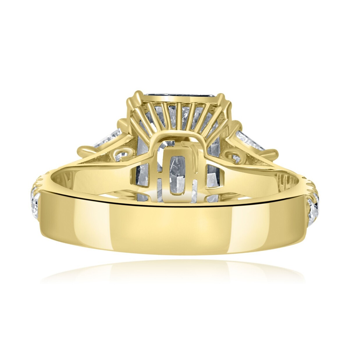 Unser Diamant-Verlobungsring besticht durch ein atemberaubendes 3-Steine-Design!! Das Herzstück ist ein 3,31 Karat IGI-zertifizierter strahlender Labordiamant im Brillantschliff, flankiert von zwei Labordiamanten im Trapezschliff von insgesamt 0,70 Karat mit runden Labordiamanten im Brillantschliff an den Seiten, alle elegant in glanzendes 14-Karat-Gelbgold eingefasst. Dieser Ring ist eine wahre Verkorperung zeitloser Eleganz und Anmut. Das Gesamtkaratgewicht betragt 4,54 Karat.