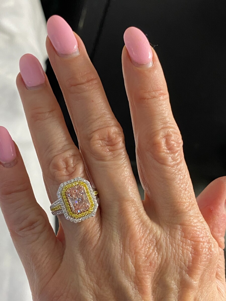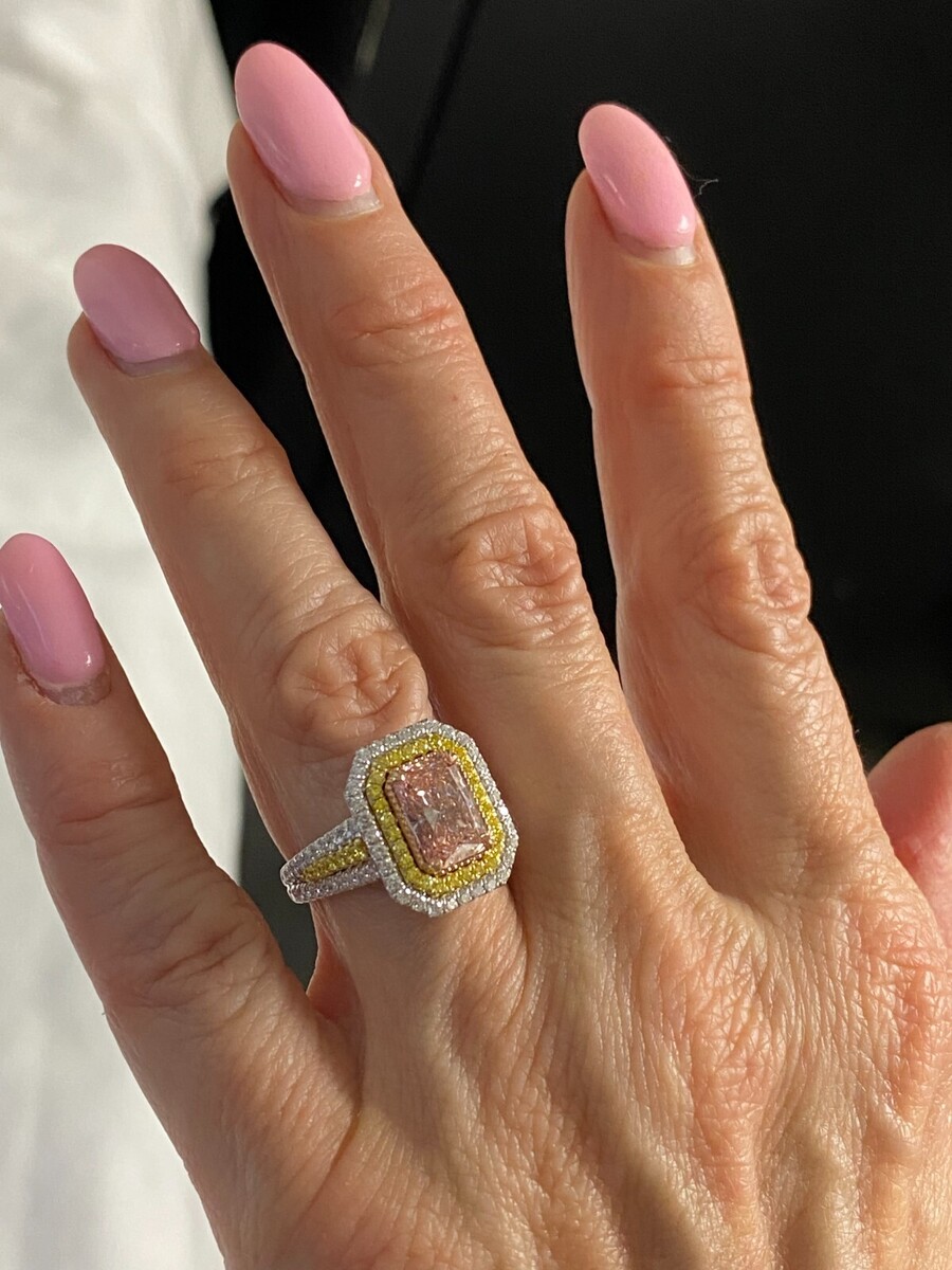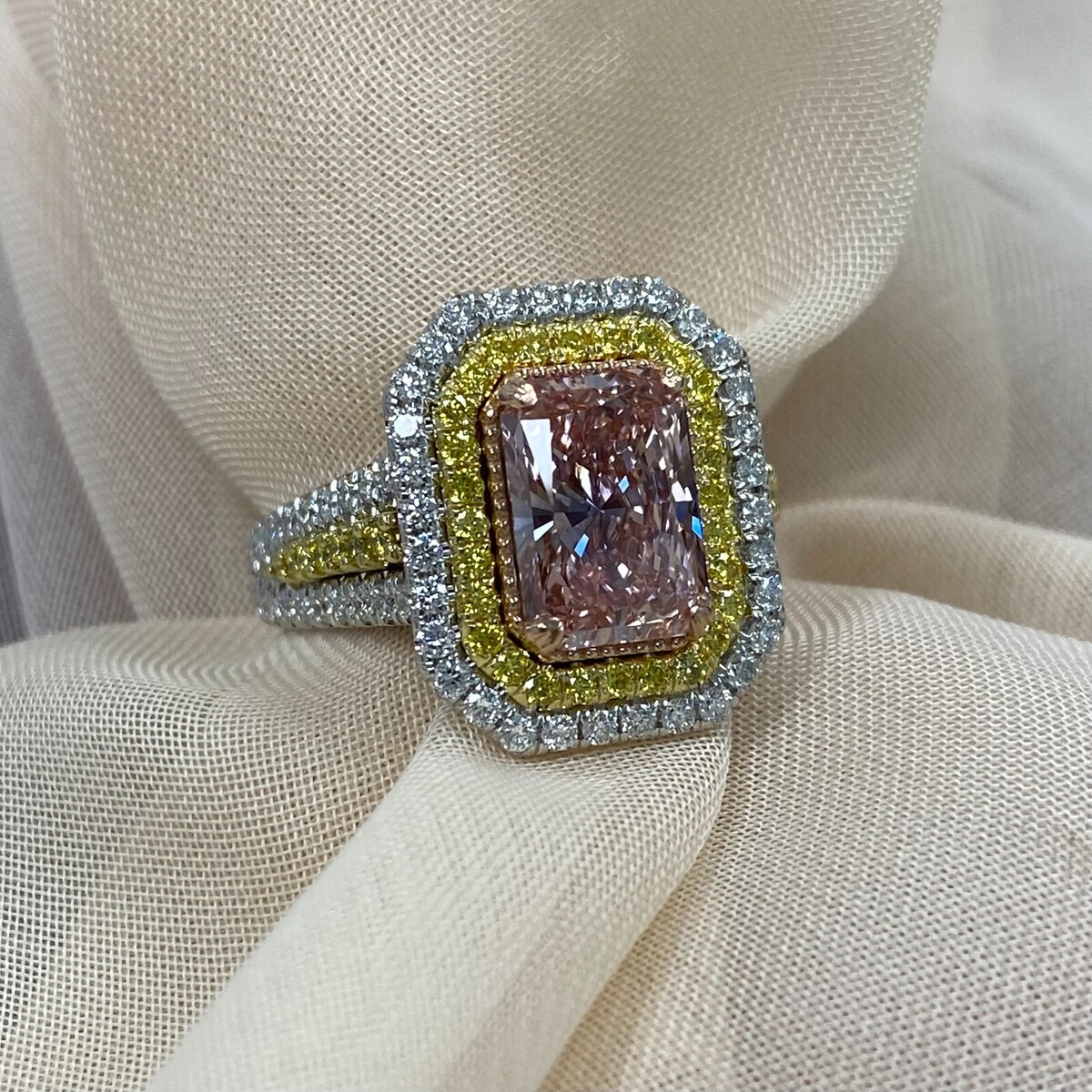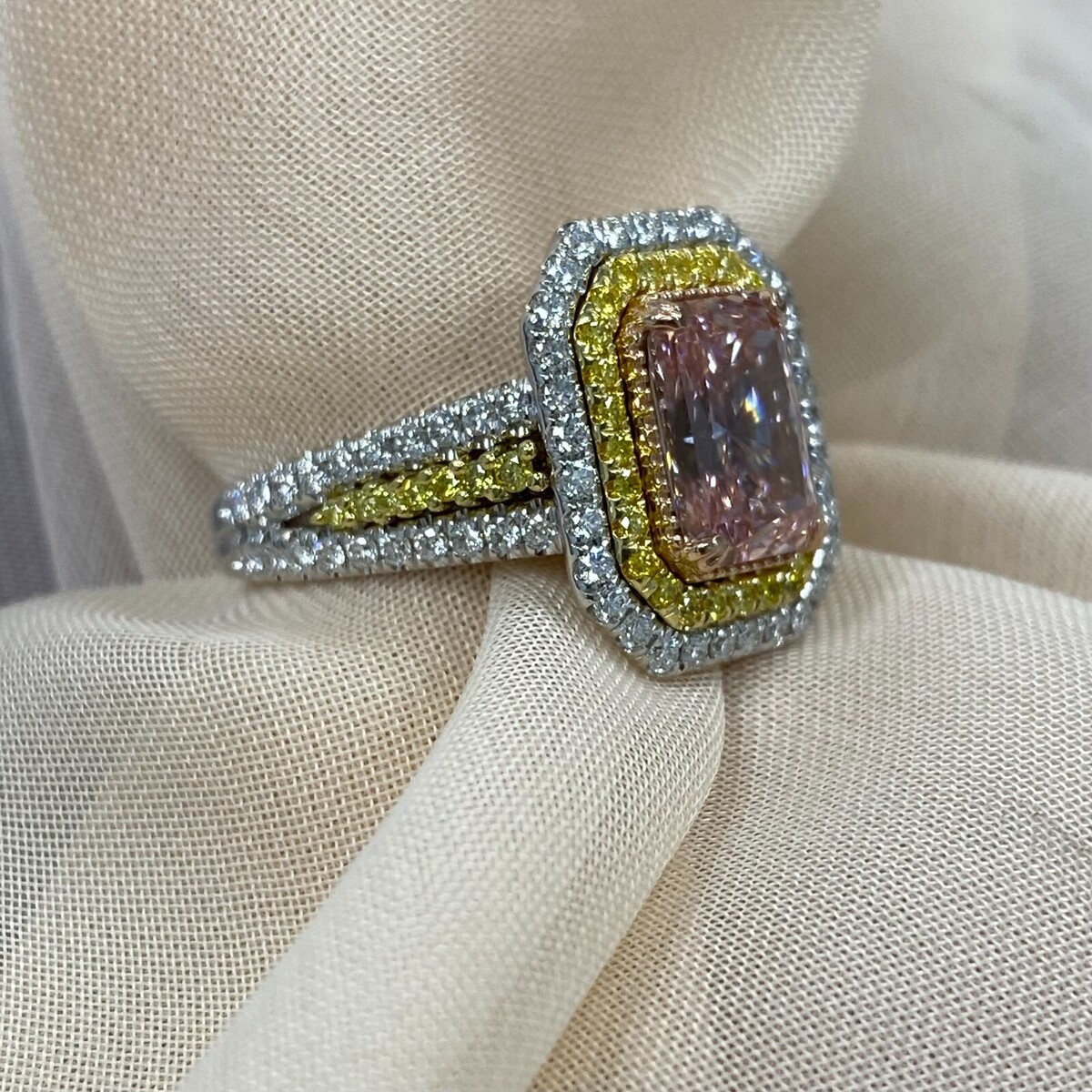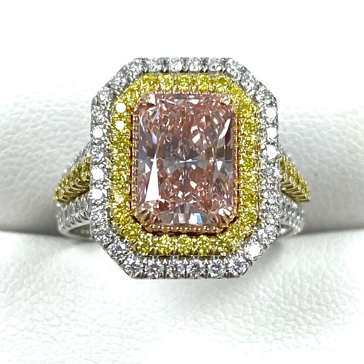 Dieser außergewohnliche Ring prasentiert einen atemberaubenden 2,06 Karat IGI-zertifizierten, leuchtend rosafarbenen, im Labor gezüchteten Diamanten im Strahlenschliff, umgeben von einem luxuriosen Doppelkranz aus fantasievollen, intensiv gelben und farblosen Diamanten. Die Kunstfertigkeit wird mit zusatzlichen Diamanten entlang der Galerie und dem geteilten Schaft fortgesetzt, die durch dazwischen eingebettete gelbe Diamanten im Rundschliff akzentuiert werden. Handgefertigt aus 14-karatigem mehrfarbigem Gold strahlt dieses Meisterwerk lebendige Eleganz aus und ist somit ein wahrhaft einzigartiger Schatz. Unsere Produkte werden alle mit Qualitat und Sorgfalt von Hand im Herzen des Diamantenviertels in der 47. Straße in New York City hergestellt. Unser Engagement und unser Engagement für gu