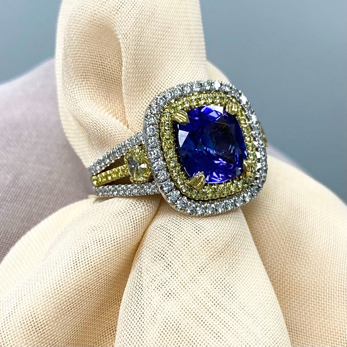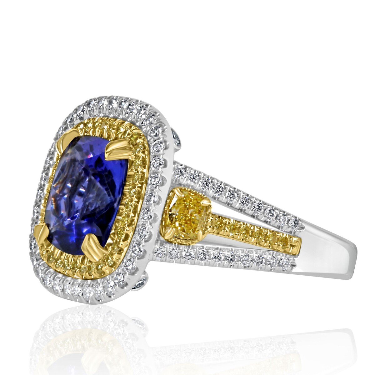 Questo splendido anello presenta una tanzanite viola blu certificata da 2,87 carati mozzafiato, circondata da un brillante doppio alone di diamanti tagli brillanti rotondi incolori e gialli. I diamanti continuano lungo il gambo a triplo split dai bordi di Milgrain, che 2 diamanti gialli fantasiosi naturali aggiungono un tocco di fascino vintage. Artigianato a mano in oro a due toni luminosi, questo anello brilla con una finitura polacca elevata che riflette l'arte e l'artigianato dietro ogni aspetto del suo design. Il peso totale dei carati e di 4,28 carati.