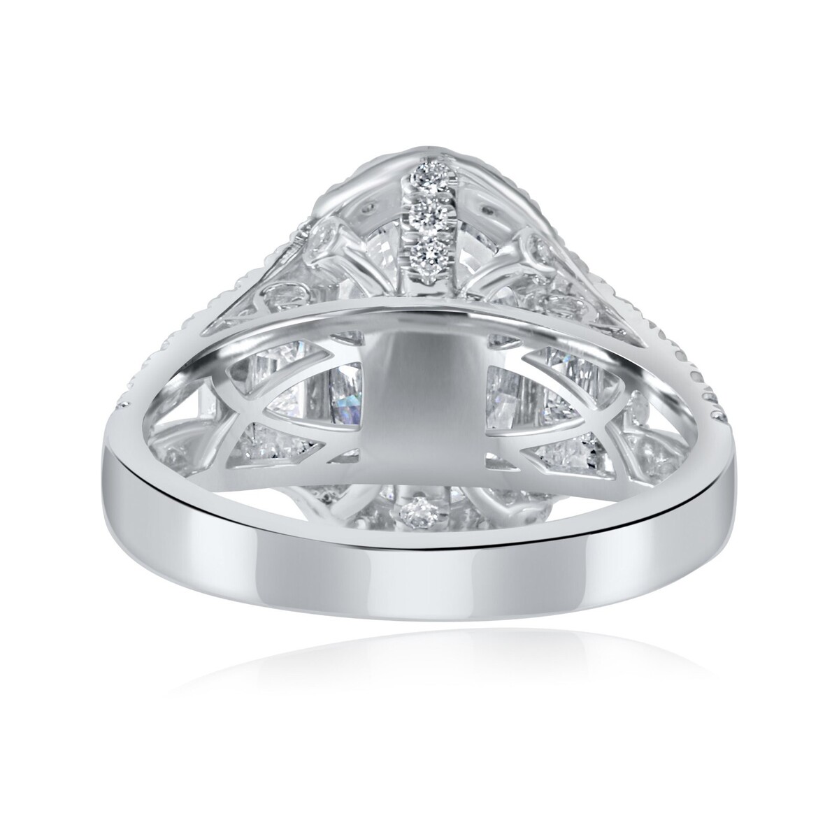 Realizzato in luminoso oro bianco 14k, questo anello presenta al centro un accattivante diamante coltivato in laboratorio certificato IGI da 3,03 carati, fiancheggiato da eleganti diamanti a taglio trapezoidale su ciascun lato. Avvolge l'insieme un delicato alone di scintillanti diamanti a taglio rotondo, che aggiungono un ulteriore tocco di brillantezza a questo pezzo.