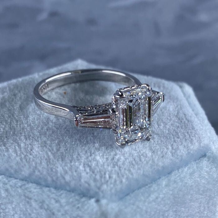 Questo splendido anello di fidanzamento con tre pietre presenta un diamante coltivato in laboratorio con taglio smeraldo centrale da 2,05 carati affiancato da due diamanti coltivati ??in laboratorio sul lato baguette. Il diamante centrale e incastonato in una montatura a griffe che consente alla luce di penetrare completamente nella pietra, mettendone in mostra la brillantezza e il fuoco. I diamanti laterali baguette aggiungono un tocco di eleganza e raffinatezza all'anello.