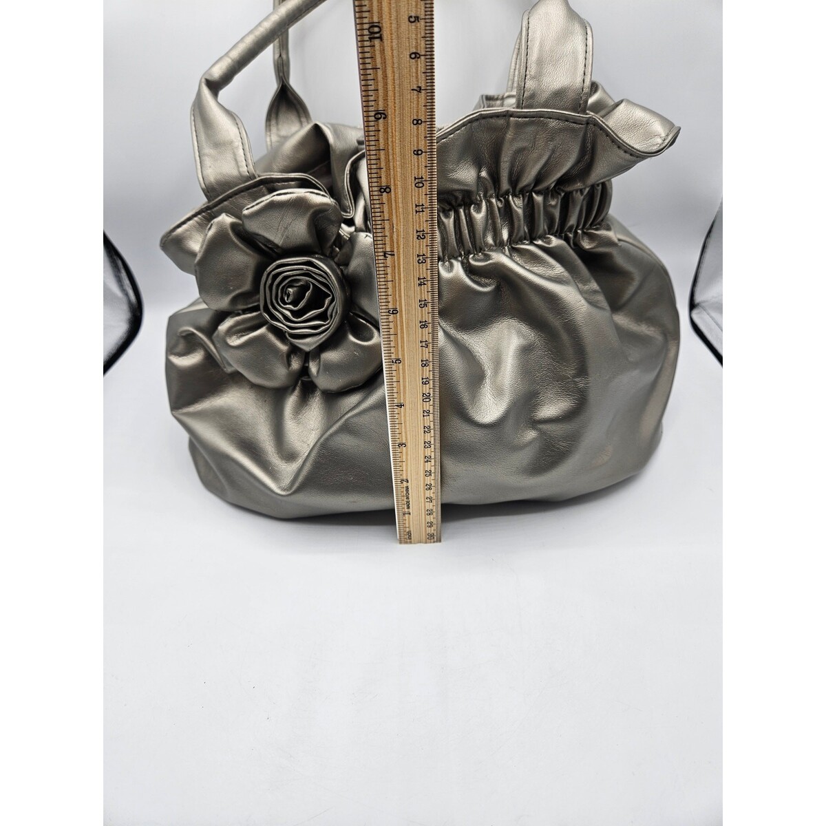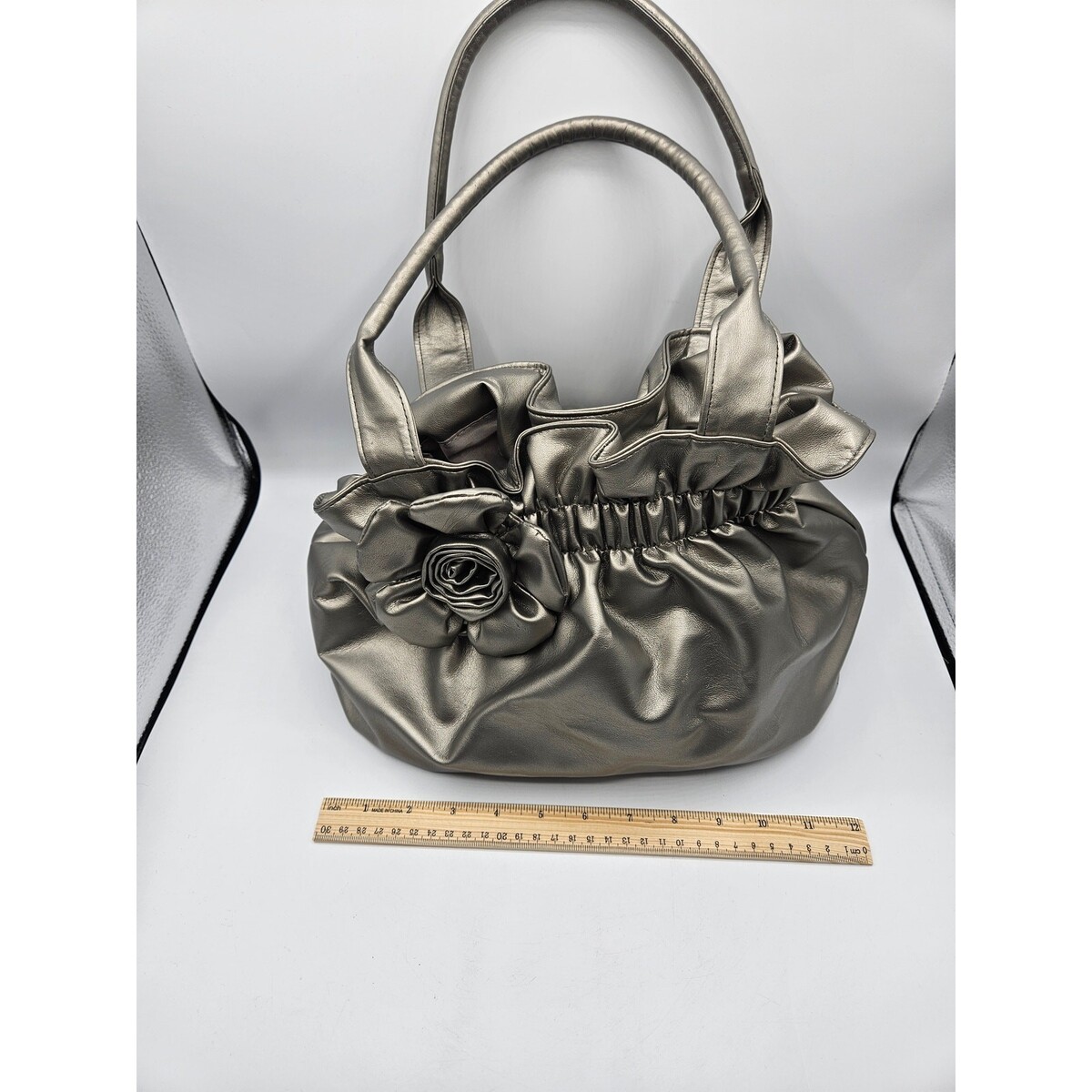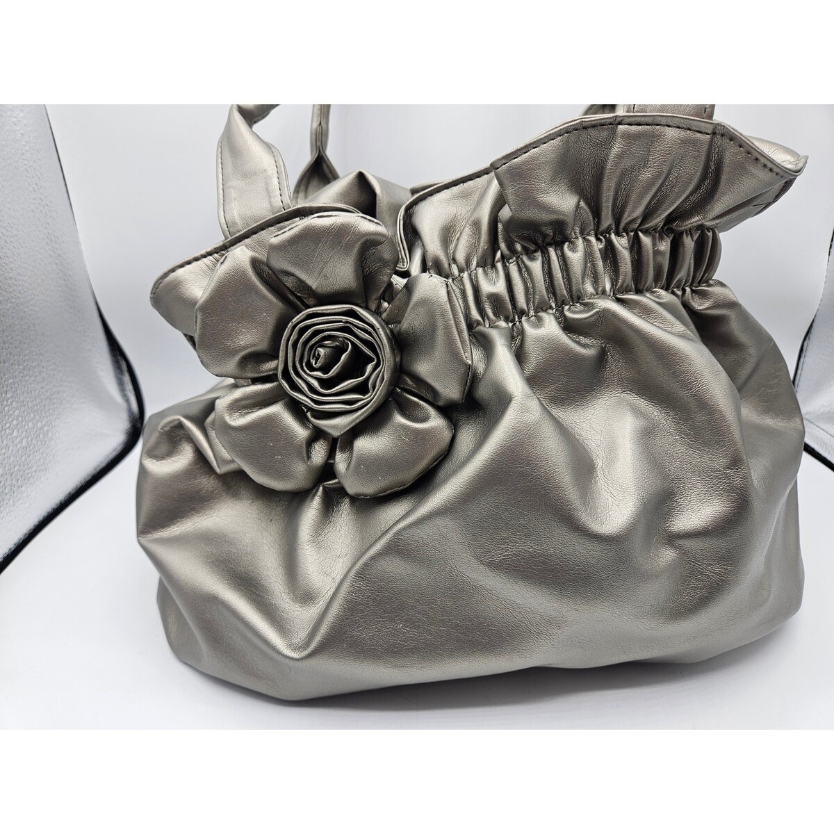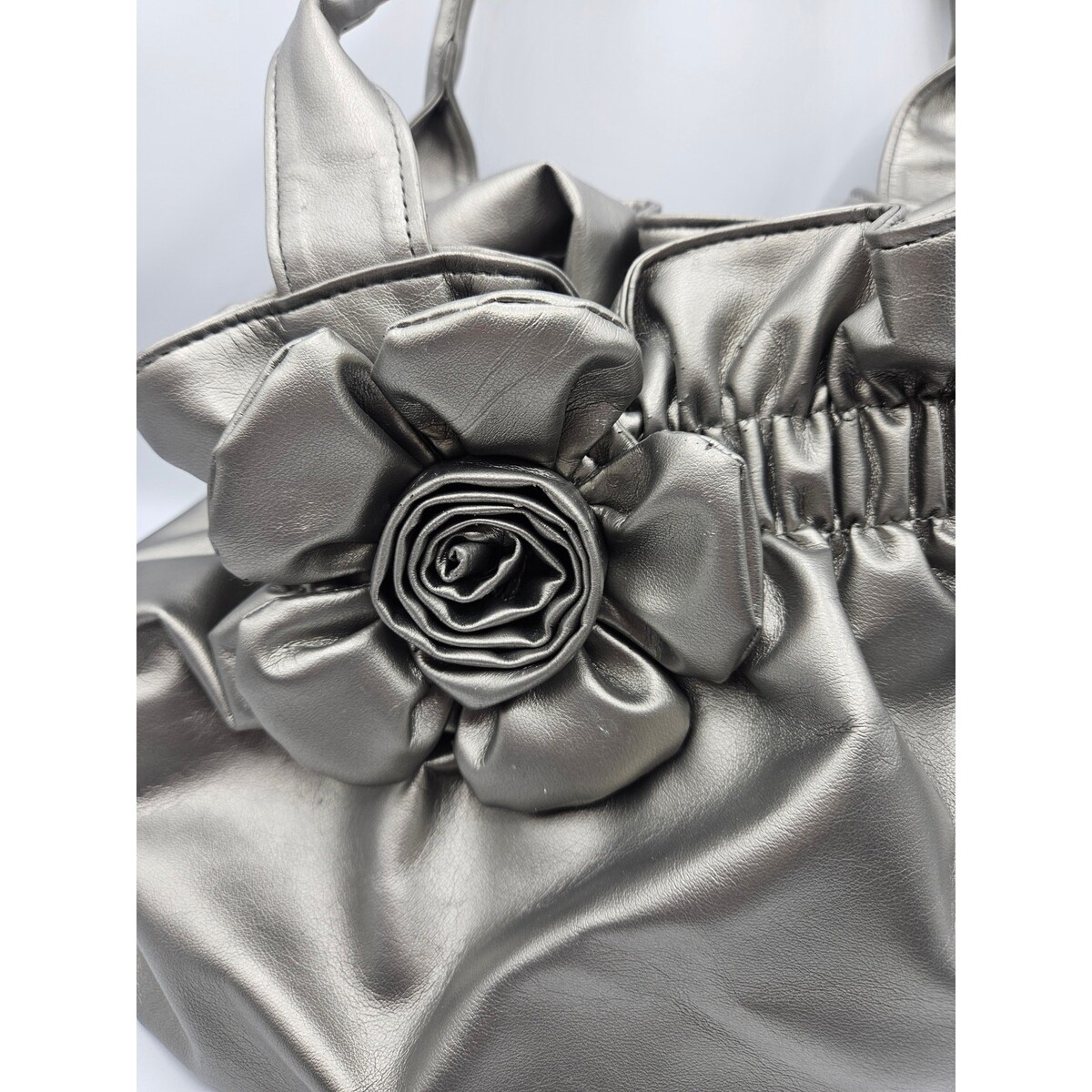 Bueno Women's Shiney Gray Puffy Handbag with Rose Decor Shoulder Bag
