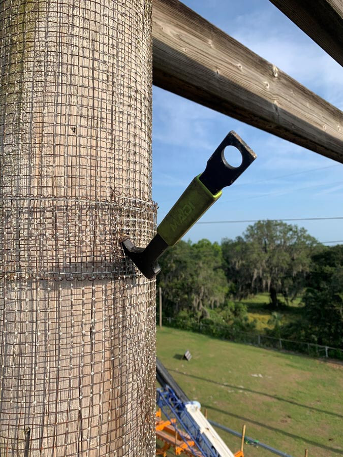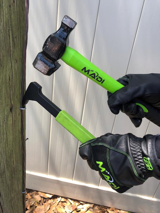 The Madi Lineman Transmission Bell Separator w/ Staple Remover is a unique three in one tool designed to easily wedge and push cotter pins back to separate bells.
