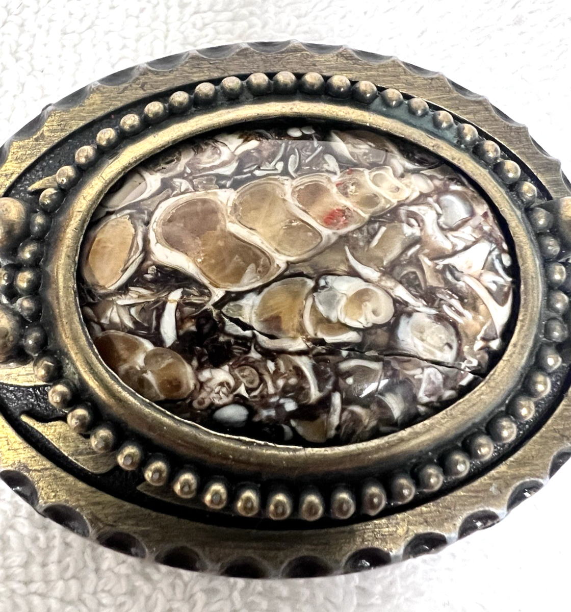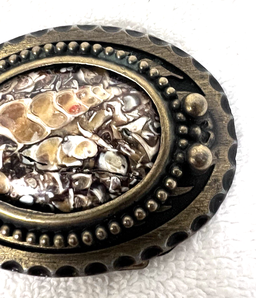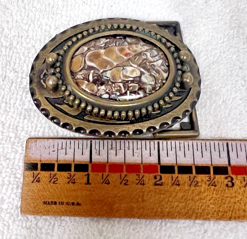 Vintage Belt Buckle Smaller w Stone Center 2 5/8 x 2 Inch Women's Kids Dark Gold The back has a CD or CB possible condition is very good the stone has a natural indent spot but its wonderful it looks like a seashell? in stone???