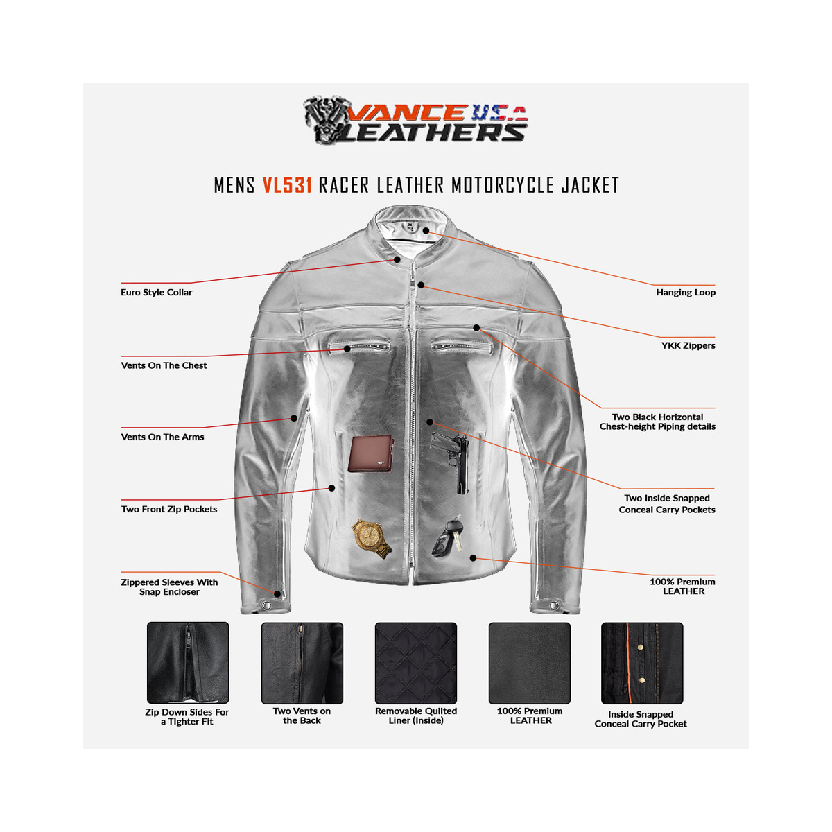 The use of YKK zippers additionally emphasizes the attention to detail and commitment to quality in the design of this jacket. Vance Leather s Premium Cowhide Leather Racer Commuter Motorcycle Jacket is an excellent choice for riders who demand both style and functionality in their motorcycle gear.