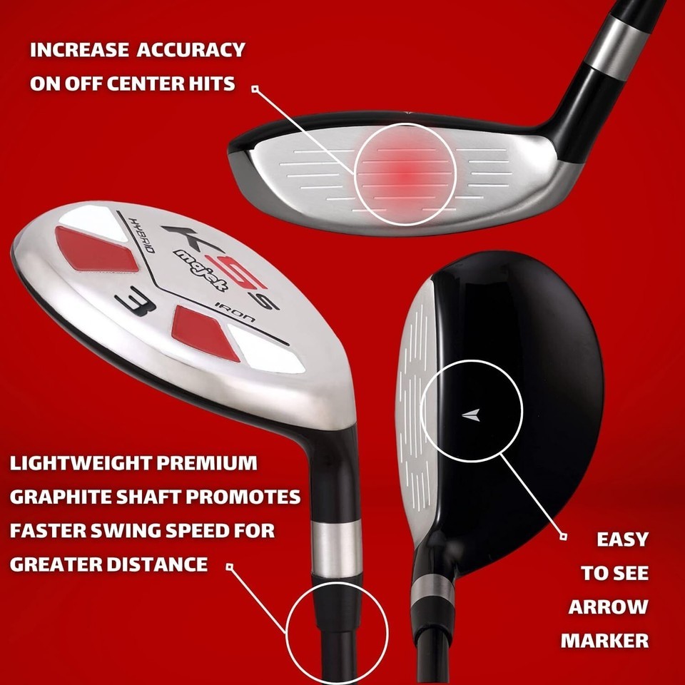 Replace Your Entire difficult to use iron set with the Majek One Length K5 all hybrid iron set! Every Club is the same length as the #7 Hybrid. Majekally improve your Hybrid-Iron game! Pure Golf Engineering: Majek Hybrid was Co-Engineered by members of the UCLA's engineering department. This unique relationship and pure engineering approach created the Majek All Hybrid Iron Set. Benefits of the Majek Hybrid: -More Weight Positioned Behind The "Sweet Spot" -Deeper Cavity Back Creates A Tighter Shot Dispersion, Which Increases The Accuracy On Off Center Hits. -Aerodynamic Design Creates A Reduction In Drag, Which Leads To Higher Club Head Speeds -Wide To Thin Crown Design Creates A Lower CG To Promote Higher Launch Angle For More Distance -Lightweight Premium Graphite Shaft Promotes Faster Swing Speed For Greater Distance. -Black Crown And Arrow Markers Make Alignment Easy And Eliminates Glare. Support A Local Company: Your Custom Made Majek Golf Hybrid Is Assembled By Hand In Riverside, CA, USA And Delivered Direct To Your Door.