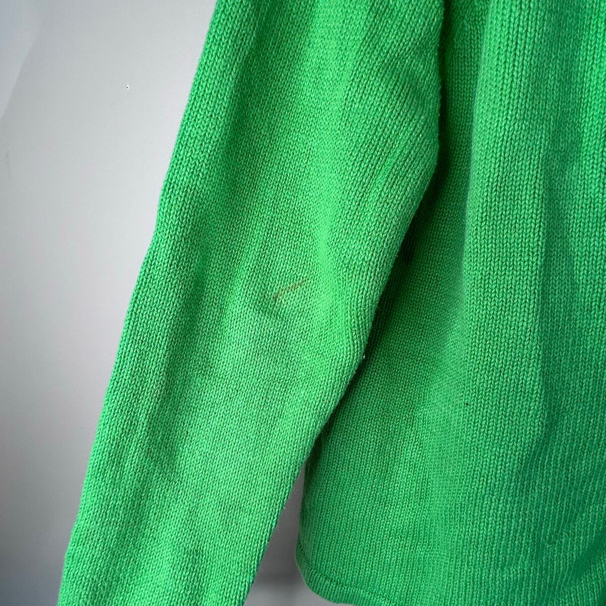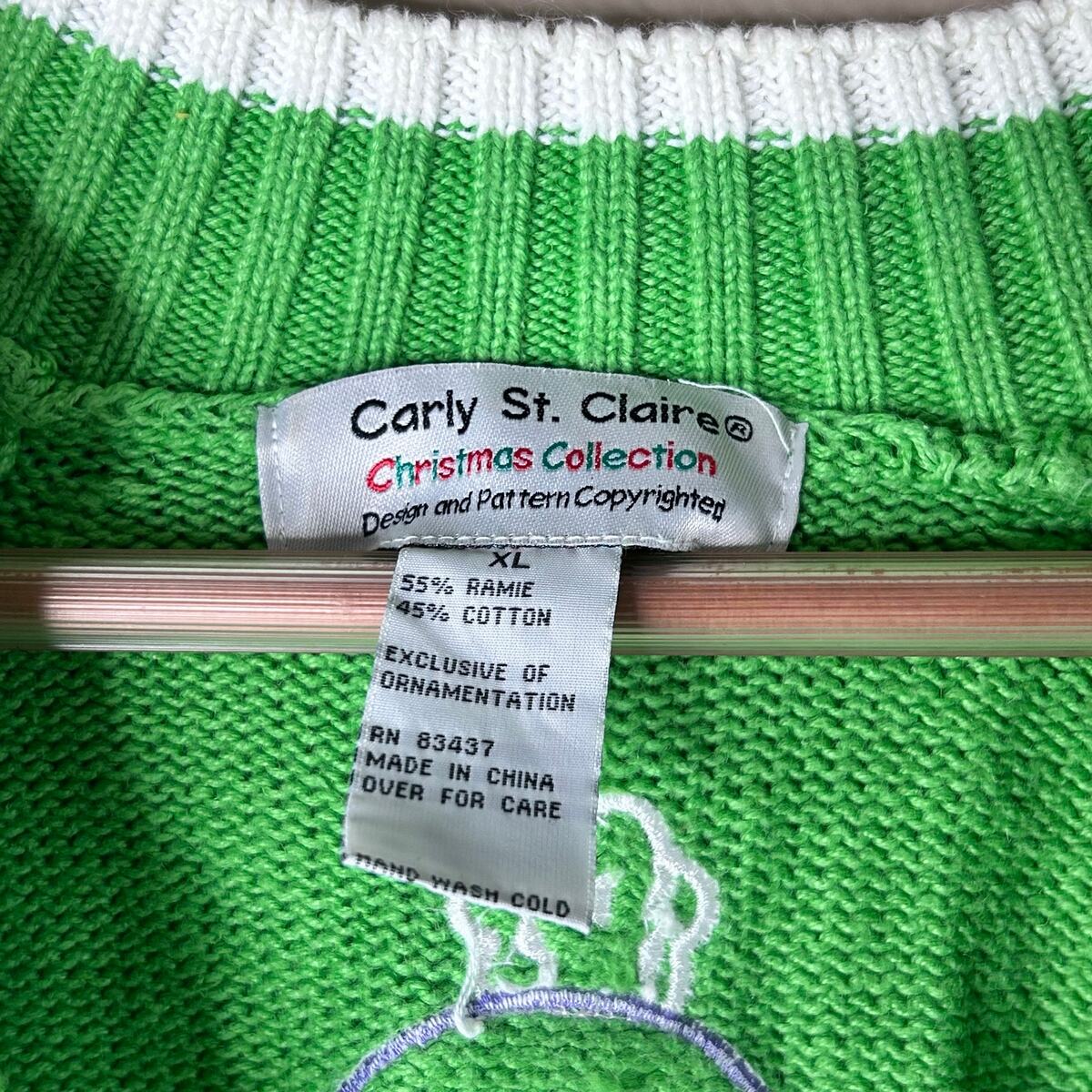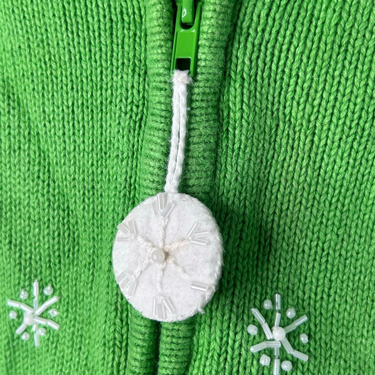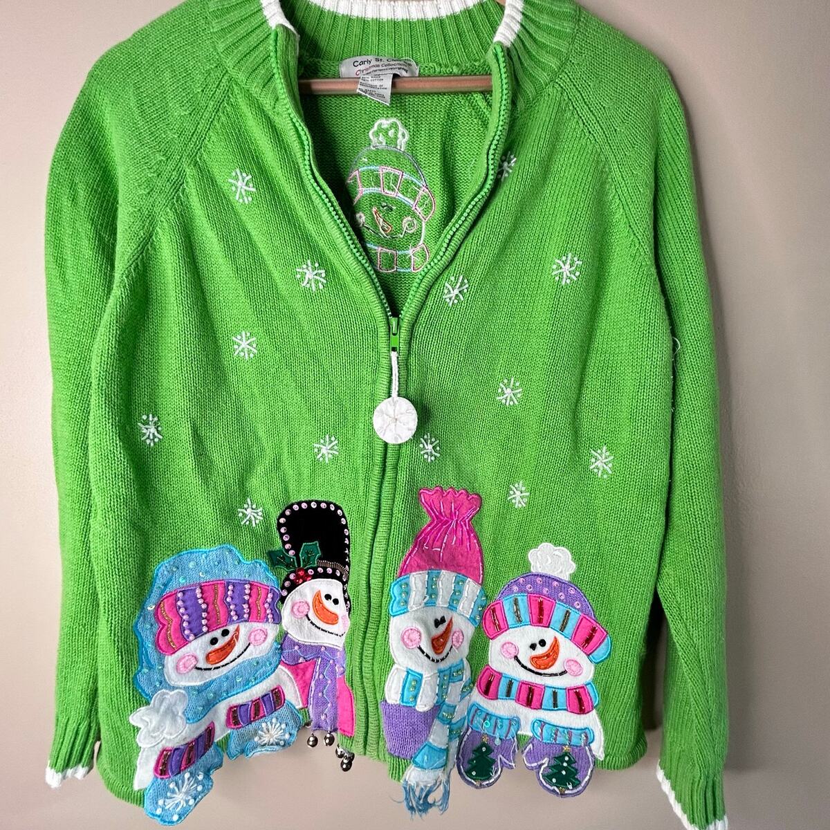 Festive Carly St. Claire Christmas Collection zip-front sweater in bright green with colorful embroidered and applique snowmen across the front. Features ribbed cuffs, zip pull charm, and winter snowflake details. Women?s size XL. Made of a soft 55% ramie / 45% cotton knit.