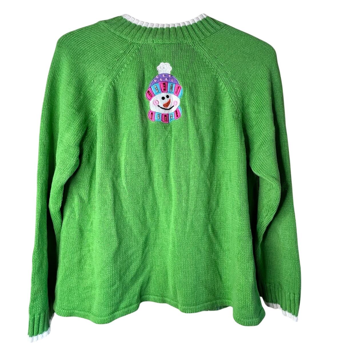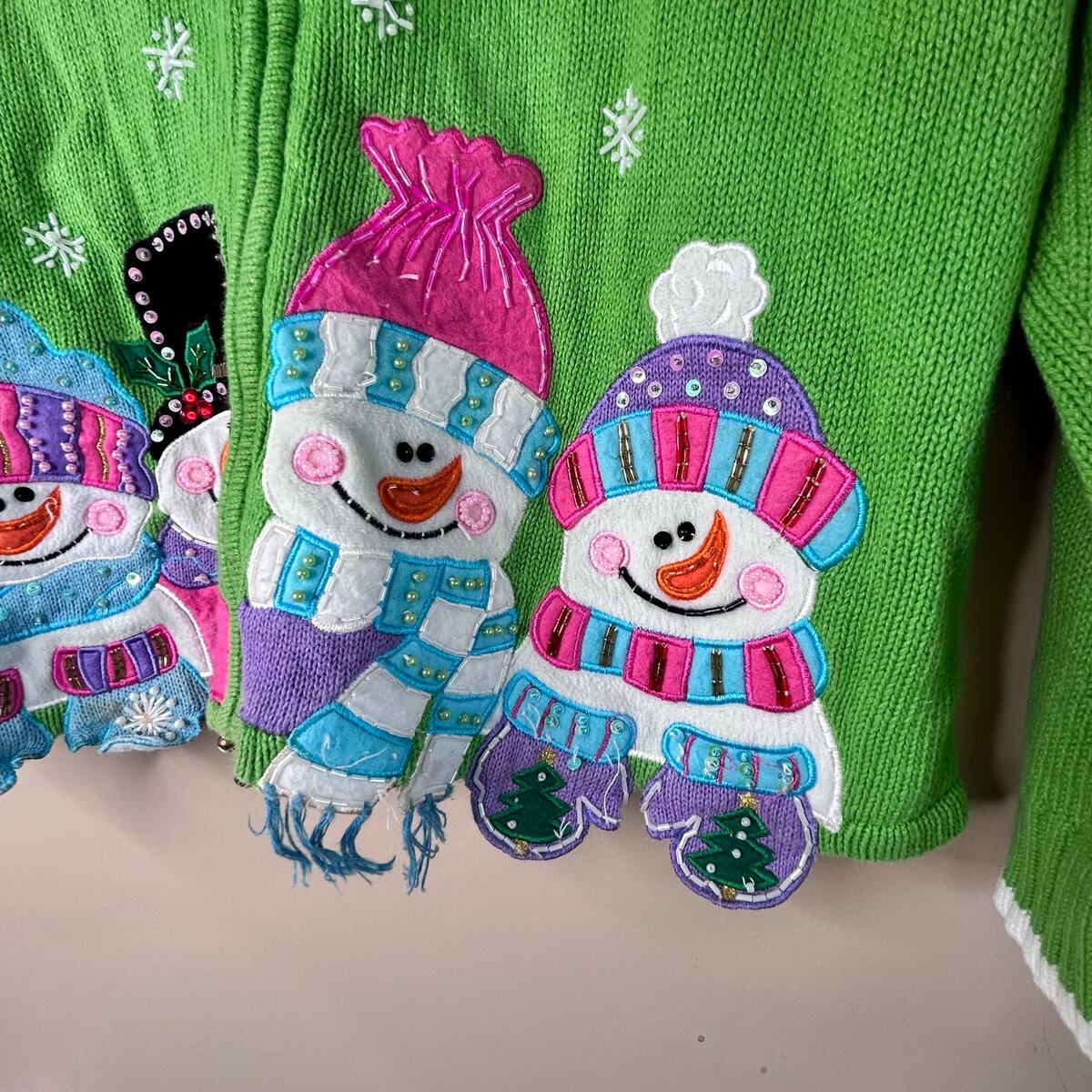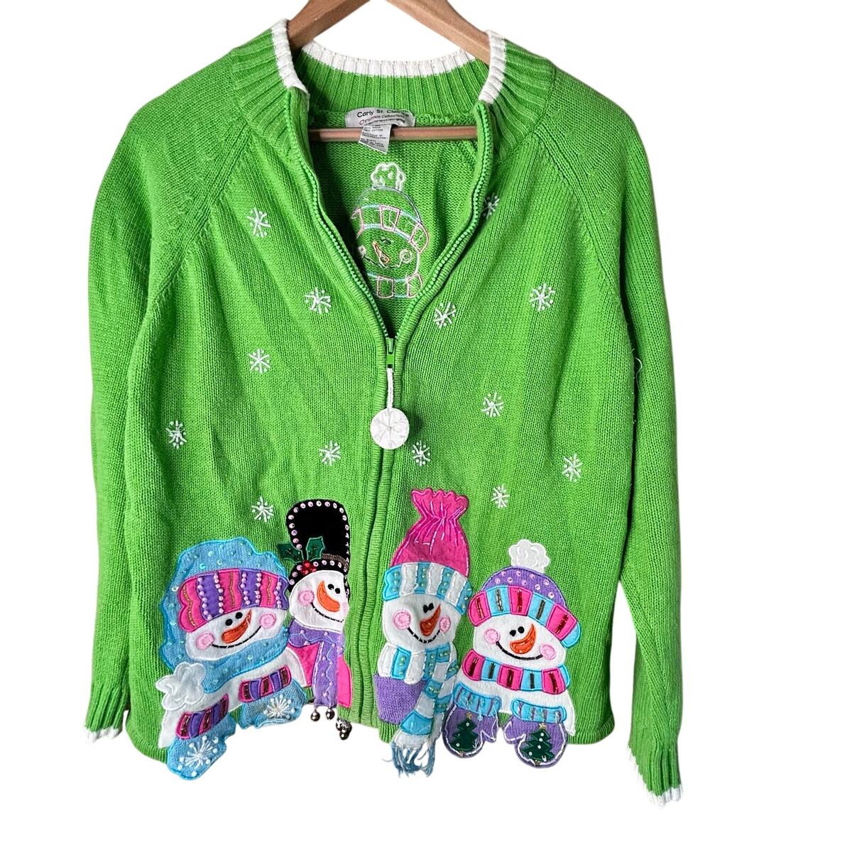 Carly St Claire Snowman Christmas Sweater Cardigan XL Green Zip Front