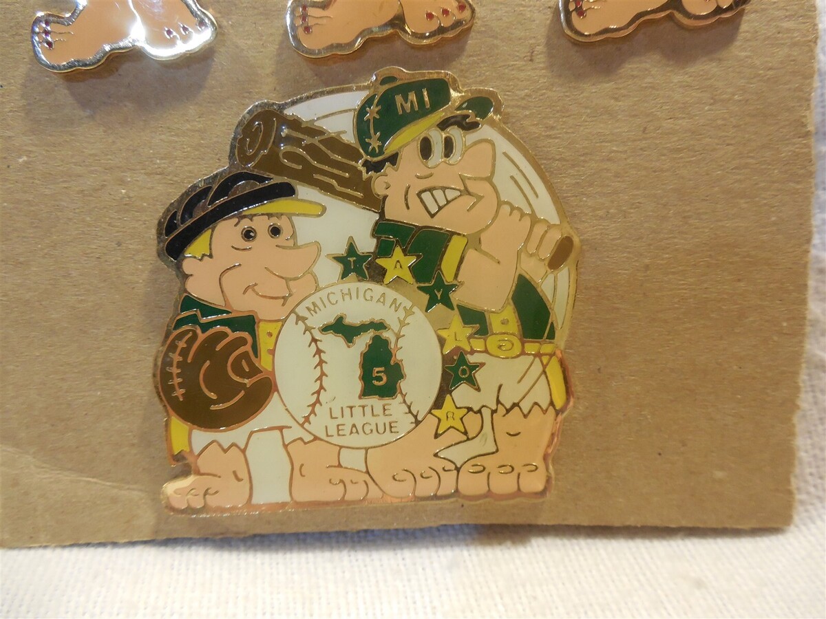 This is a set of Flintstones Little League pins. There is one pin which has Fred Flintstone and Barney Rubble. It is marked Michigan Little League 5 and has Taylor written in the stars. This pin measures approximately 2" x 2" and is missing one metal clasp on the back. There are 6 pins which have Fred Flintstones. Each of the pins are different...3 have Fred in an orange outfit and 3 have Fred in a blue-grey outfit...the hat and tie colors vary with blue, red and green. The Fred pins measure approximately 1" x 2".