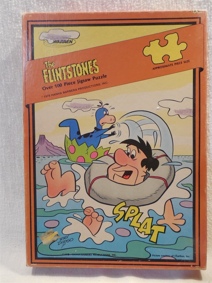 This is a Flintstones 1978 Warren 100 piece jigsaw puzzle in original box. The puzzle pictures Dino in an egg shell throwing Fred Flintstone a life preserver and is signed Ray Dirgo...the box credits Charlton, Inc for the picture. The box measures approximately 8 1/2" x 12" x 1 1/2".