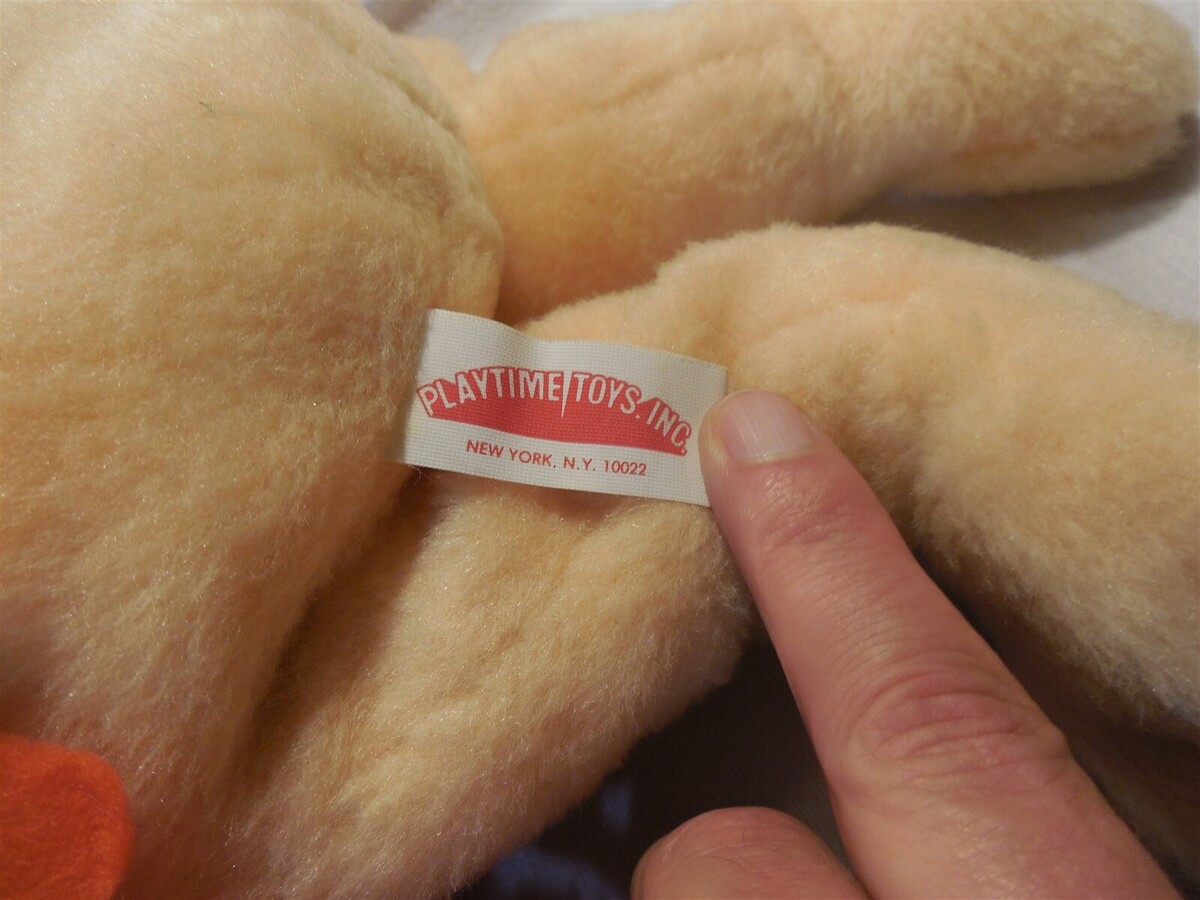 This is a Flintstones Playtime Toys stuffed plush Fred Flintstone toy. Fred has plastic eyes and fuzzy string hair. He sits approximately 14" tall when sitting, 21" total length head to toe. Fred is wearing an orange fabric outfit which looks like a hospital gown from the back...probably intentional to accommodate him sitting.