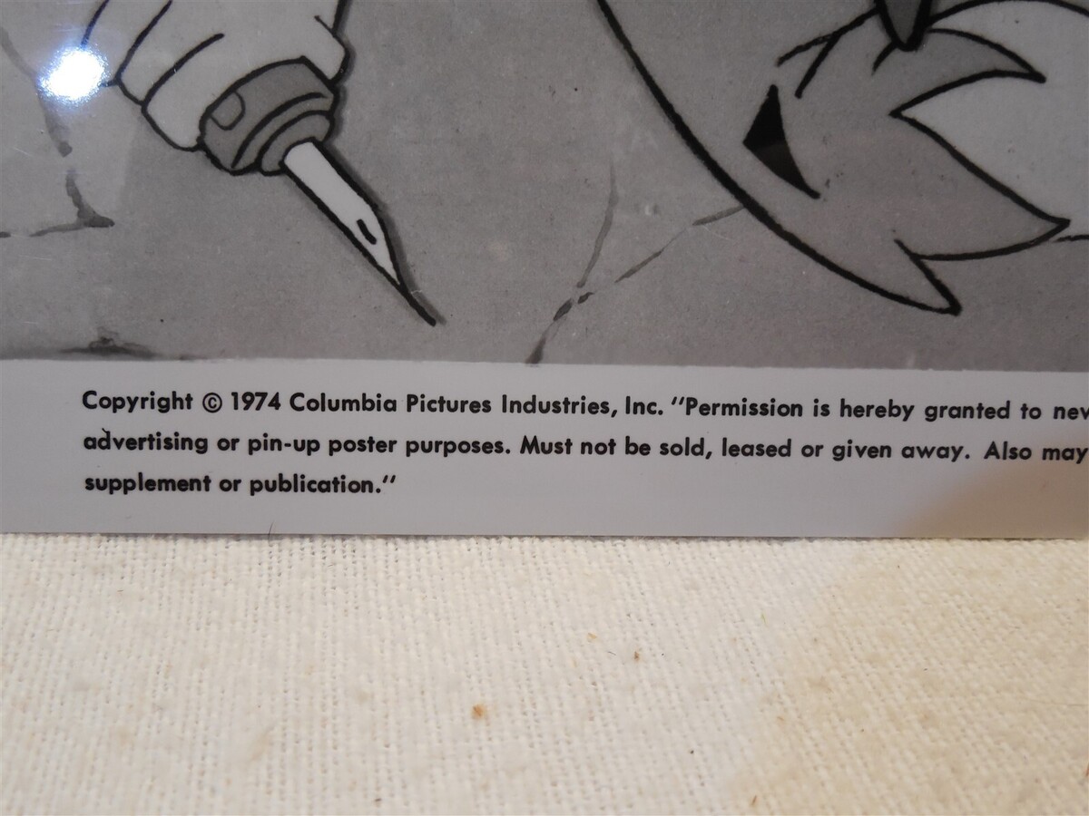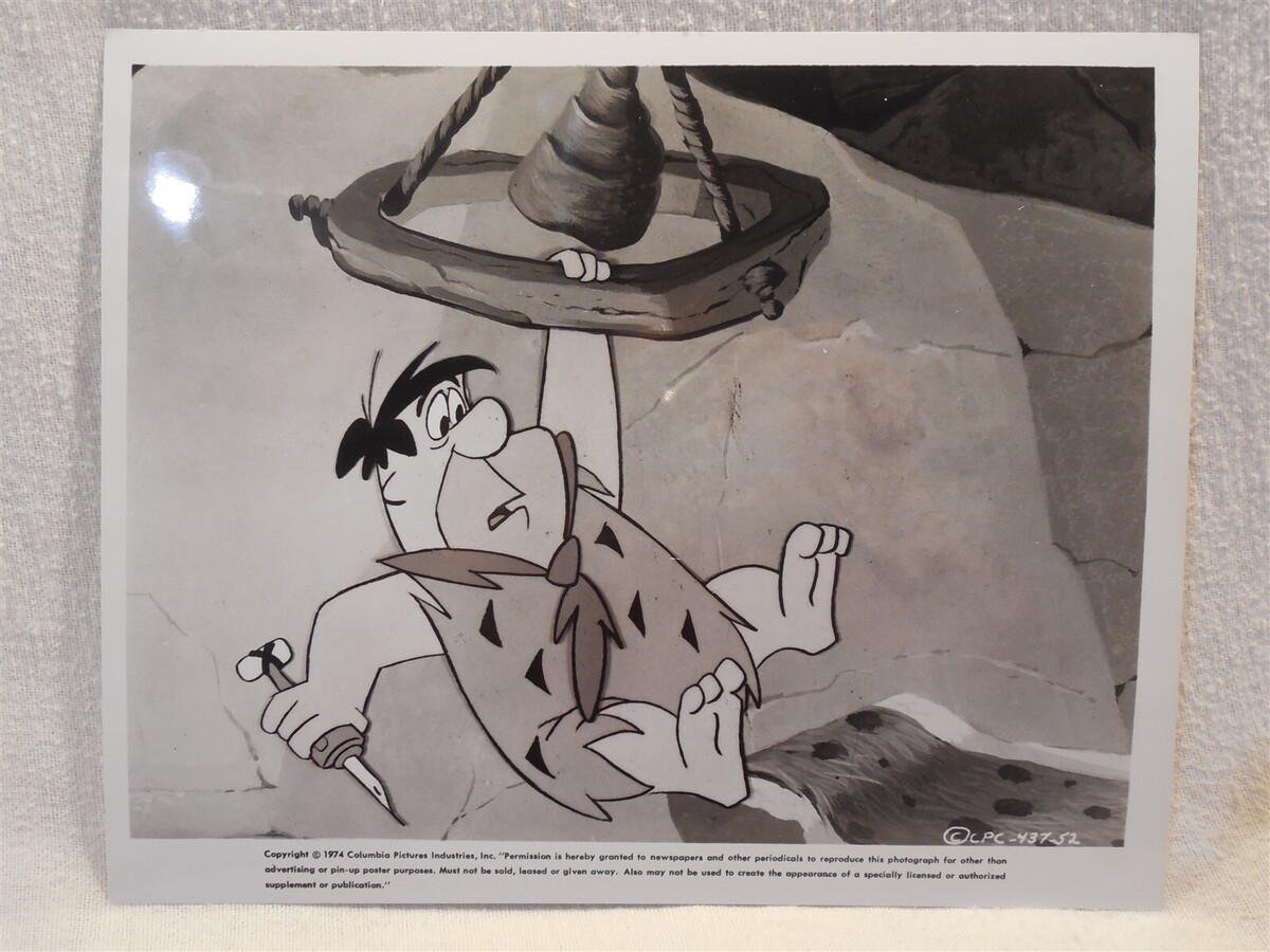 This is a 1974 Columbia Pictures Industries, Inc. black and white press photo for "The Man Called Flintstone" movie. The photo pictures Fred Flintstone hanging from a chandelier. He has a dart or some type of spy gadget in his hand. The photo measures 10" x 8".