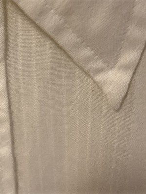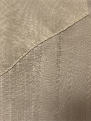 The VTG 70s H Bar C Western Pearl Snap Shirt in Men's XL size is a vintage piece with a classic Western theme. This off-white button-up shirt features a collared neckline, long sleeves with snap closures, and a striped pattern. Made from Permanent Press material, it is machine washable and lightweight with a stretch fit. Perfect for casual wear, this shirt also includes long tails and pockets, adding to its retro charm. The H Bar C brand and United States origin add a unique touch to this timeless piece.
