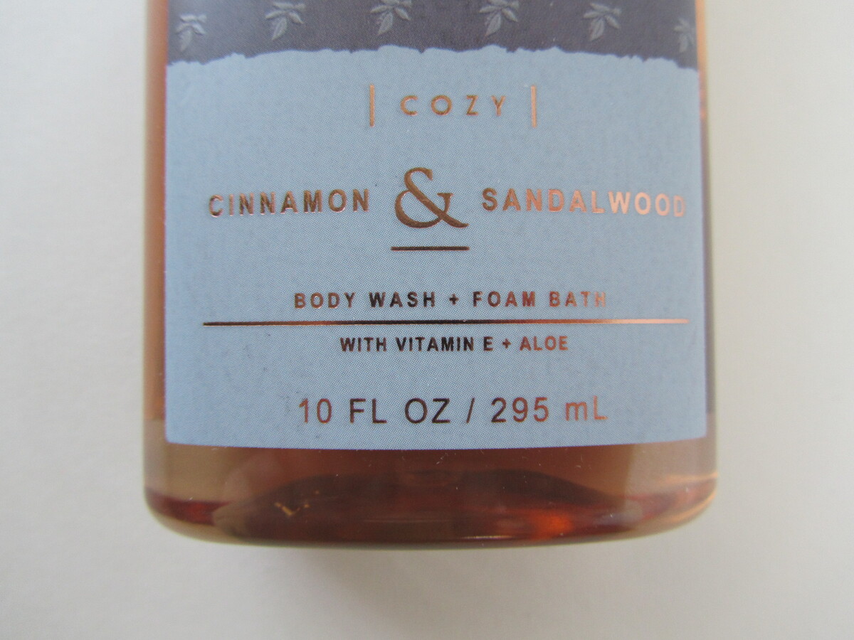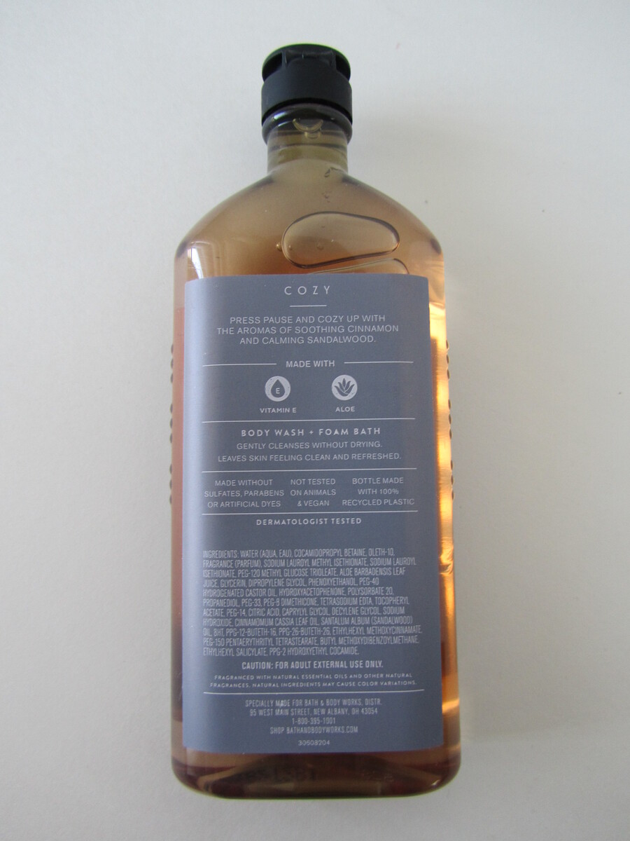 For sale is New Aromatherapy Cozy Cinnamon Sandalwood Body wash + Foam bath with Vitamin E and Aloe Natural Essential Oils, 10 fl oz / 295 ml by Bath and Body Works.