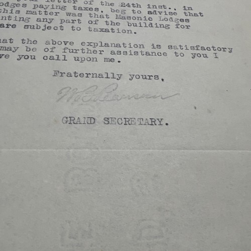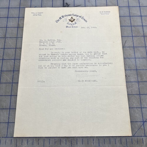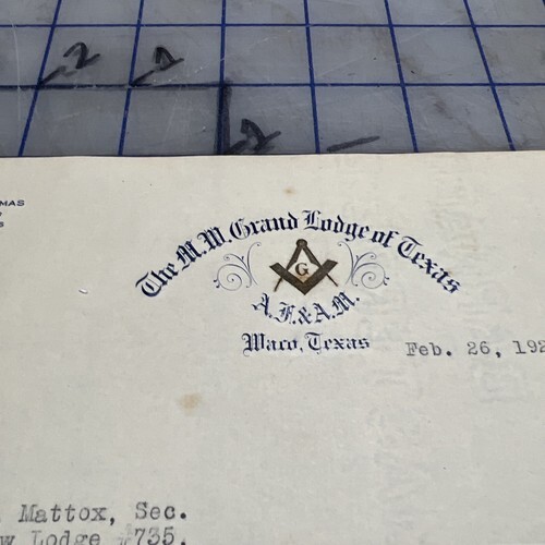 The W.M. Grand Lodge Of Texas A.F. & A.M. 1923 Letter Waco Texas