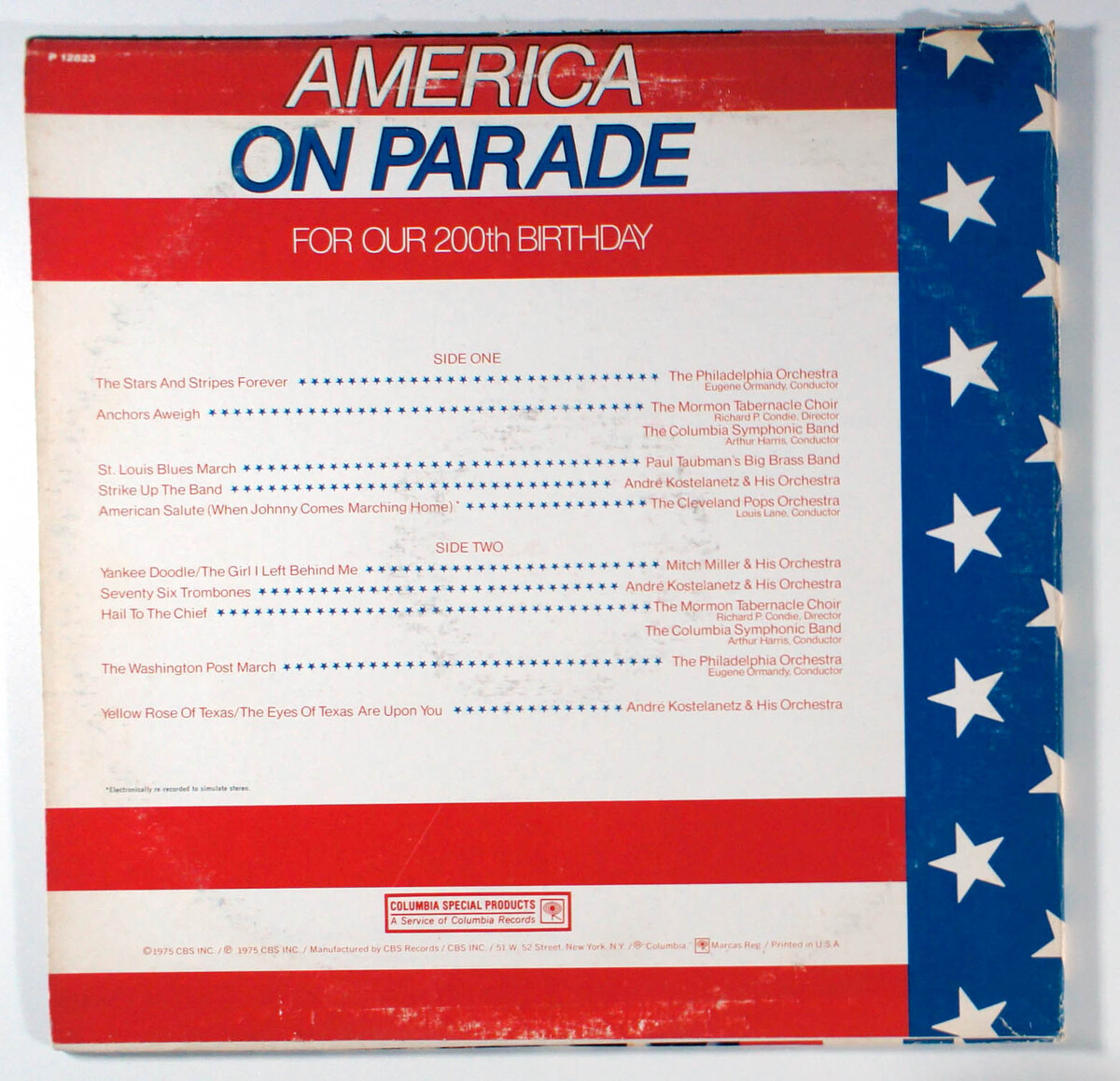 America On Parade For Our 200th Birthday is a patriotic album featuring orchestral and choral renditions of iconic American marches, anthems, and folk tunes performed by esteemed ensembles such as the Philadelphia Orchestra, the Mormon Tabernacle Choir, Andr Kostelanetz His Orchestra, and Mitch Miller His Orchestra. The tracklist includes classics like The Stars and Stripes Forever, Anchors Aweigh, Yankee Doodle, Seventy-Six Trombones, Hail to the Chief, The Washington Post March, and Yellow Rose of Texas, evoking the spirit of national pride through spirited brass and symphonic arrangements. Released in anticipation of the United States Bicentennial celebrations marking the 200th anniversary of the Declaration of Independence in 1976, the album served as a musical tribute to American history and achievements, aligning with a nationwide wave of events including parades, fireworks, and community gatherings that emphasized renewal and traditional values following the turbulent years of the Vietnam War and Watergate. This special products release, typical of Columbia's budget-line offerings, captured the era's nostalgic patriotism, with President Gerald Ford's symbolic gestureslike lighting a lantern at the Old North Church in 1975further amplifying the cultural context. Notably, the album produced no hit singles, as its selections were timeless standards rather than contemporary chart-toppers.