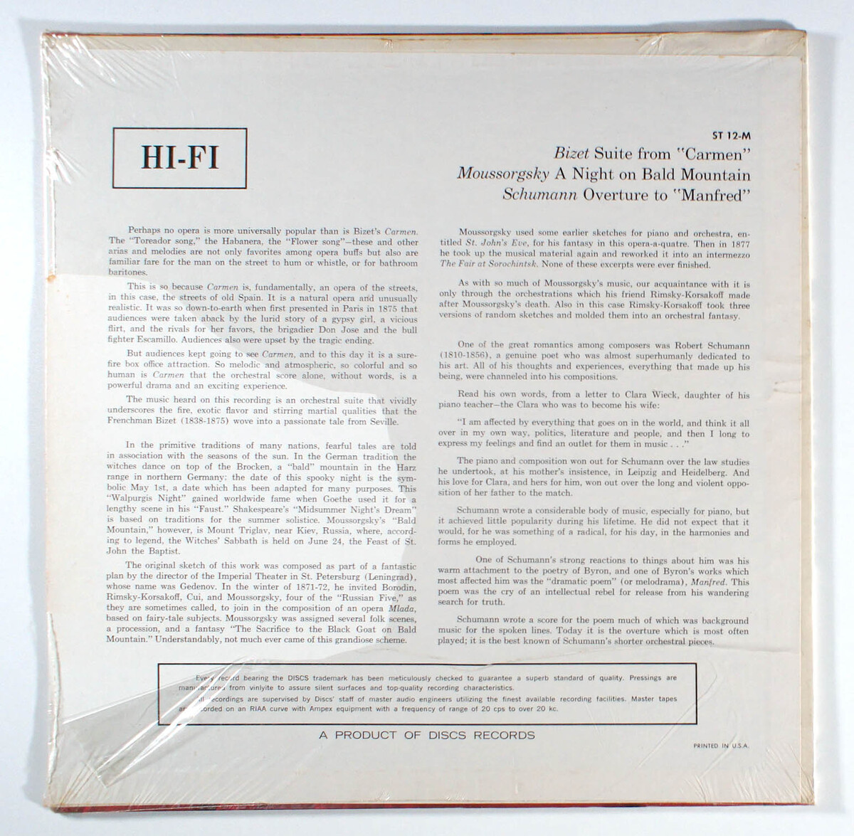 Symphonic Treasures, 12 cataloged as ST 12-M on Disc Records, is a 12-inch vinyl LP from the Symphonic Treasures series, featuring orchestral performances of classical works, including Georges Bizets Suite from Carmen, Modest Mussorgskys A Night on Bald Mountain, and Robert Schumanns Overture to Manfred. Released in the United States as part of a mid-1950s budget-friendly classical series, it aimed to make high-quality symphonic music accessible to a wider audience during the vinyl boom, capitalizing on the eras growing interest in hi-fi audio systems. This album, manufactured and printed in the U.S., holds historical significance for its role in democratizing classical music through affordable LPs, contributing to the post-war cultural appreciation of orchestral works. The selections, performed by skilled orchestras, showcase dramatic and evocative pieces, with A Night on Bald Mountain particularly notable for its vivid imagery, later popularized in Disneys Fantasia (1940).