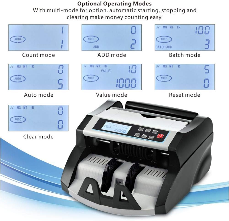 [Multiple Modes for Choice ] This bill counter has Value Counting,Auto/Manual,Add,Batch,Counting,Detection,Reset modes for optional. These modes can meet various cash counting demands.