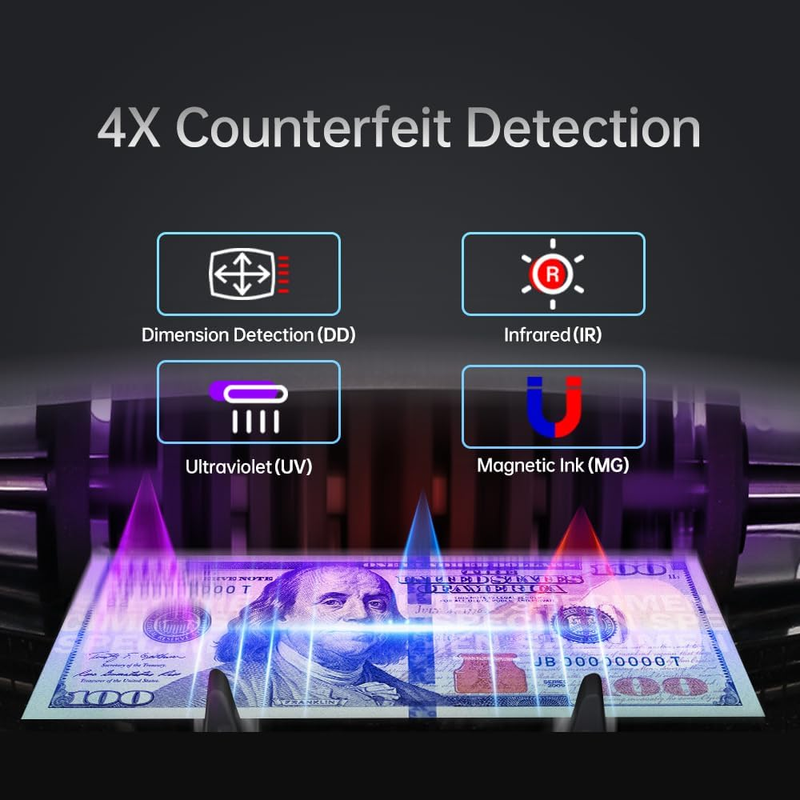 4X counterfeit detection via Ultraviolet (UV), Magnetic Ink (MG), Inrared and Dimension Detection (DD)