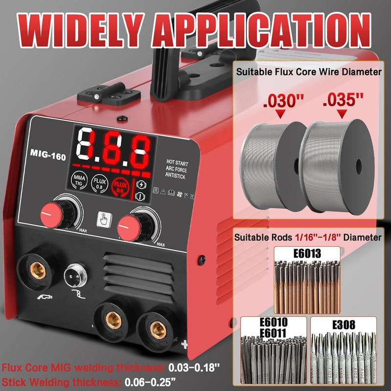 ?Wide Application?MIG welding mode thickness: 0.03-0.18?, suitable for .030? and .035? welding wire; stick welding mode thickness: 0.06-0.25?, suitable for 1/16?-1/8? AWS E6013, E6011, E6010, and E308 welding rods, making it an ideal choice for a variety of metals, including low-carbon steel, carbon steel and cast iron.