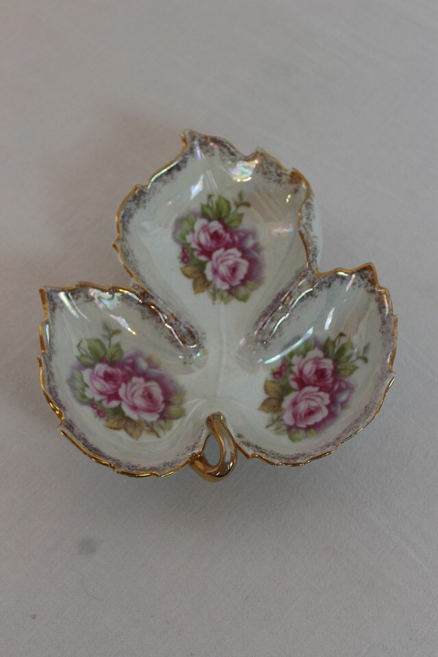 VTG. LEFTON CHINA LEAF SHAPE ROSEBUD GOLD TRIM TRINKET DISH