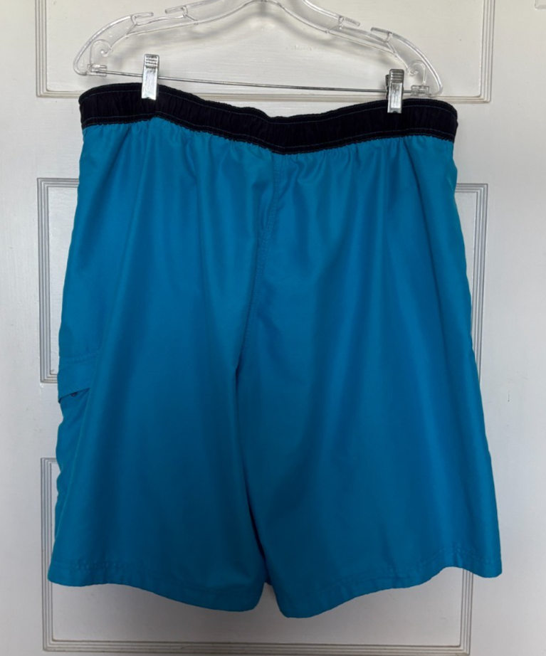 Speedo Blue Black Men?s Bathing Trunks Size XL. Bright blue men?s trunks that close with hook and loop tape as well as drawstring. 100% Polyester and Machine Washable. Waistband measures 38?. Inseam is 10?. Rise is 12.75?. Total length from the top of the waistband to hem is 23?. 3 pockets (1 seals shut with hook and loop tape. Very Good Used Condition - See Photos for further description.