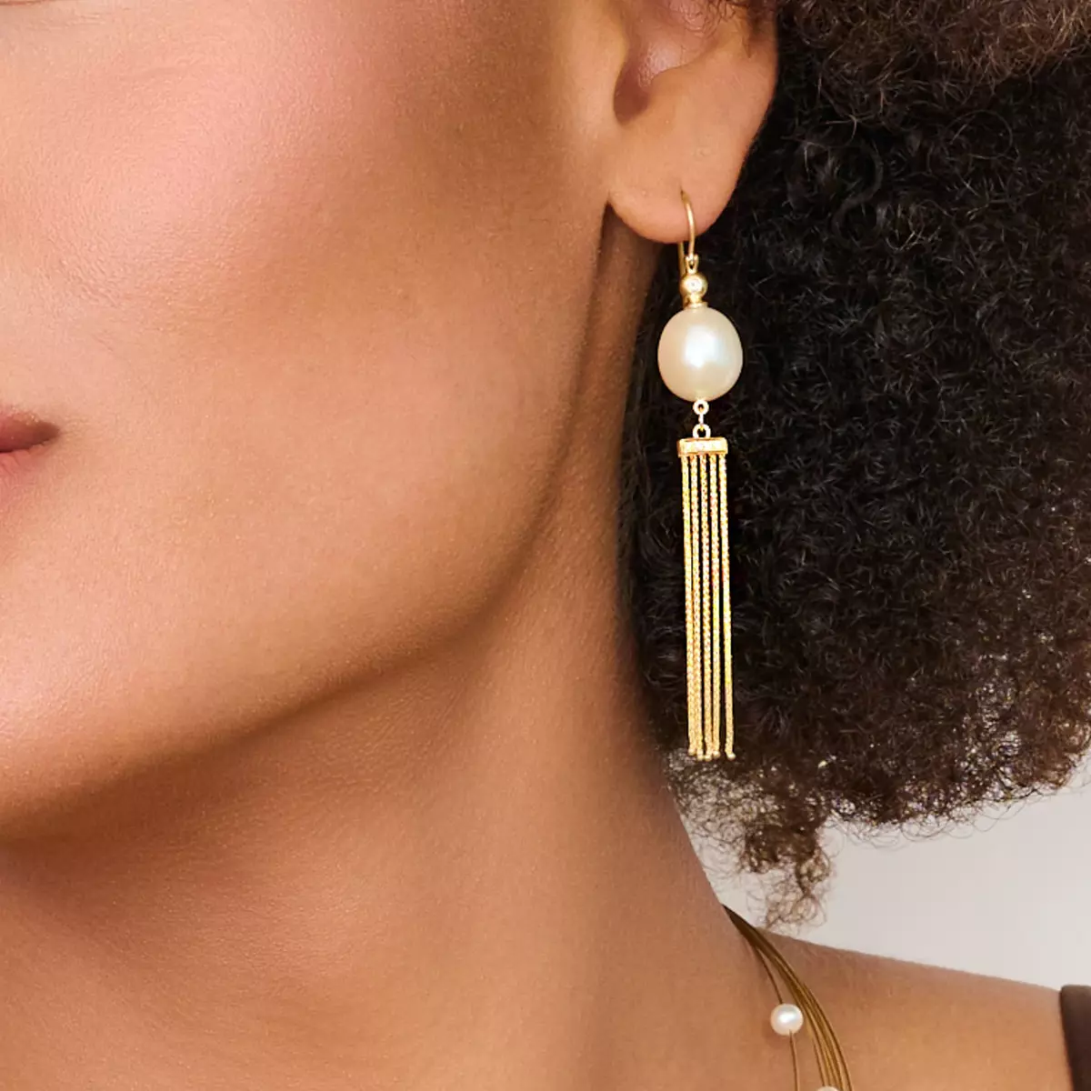 Turn heads and make a bold statement with the white pearl and diamond 14k gold tassel drop earrings. The luxurious gold tassels sway gracefully, crafting an eye-catching look that’s bound to steal the spotlight. Perfect for those unforgettable evenings when you want to dazzle and leave a lasting impression.