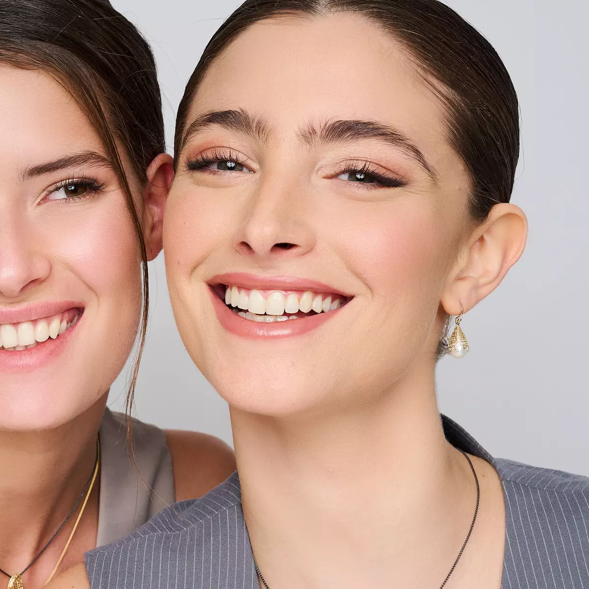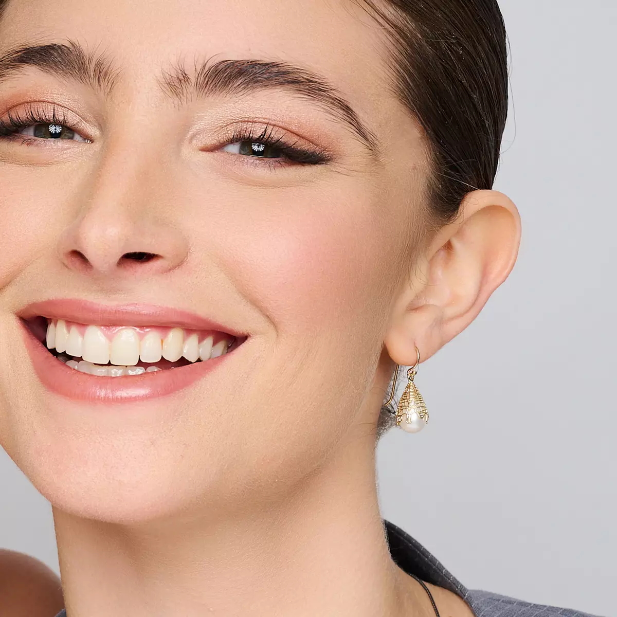 Mixed detailing harmonizes in these drop earrings, where finely threaded 14k gold intertwines with white pearls, crafting a delicate interplay that will undoubtedly enhance any look with sophistication.