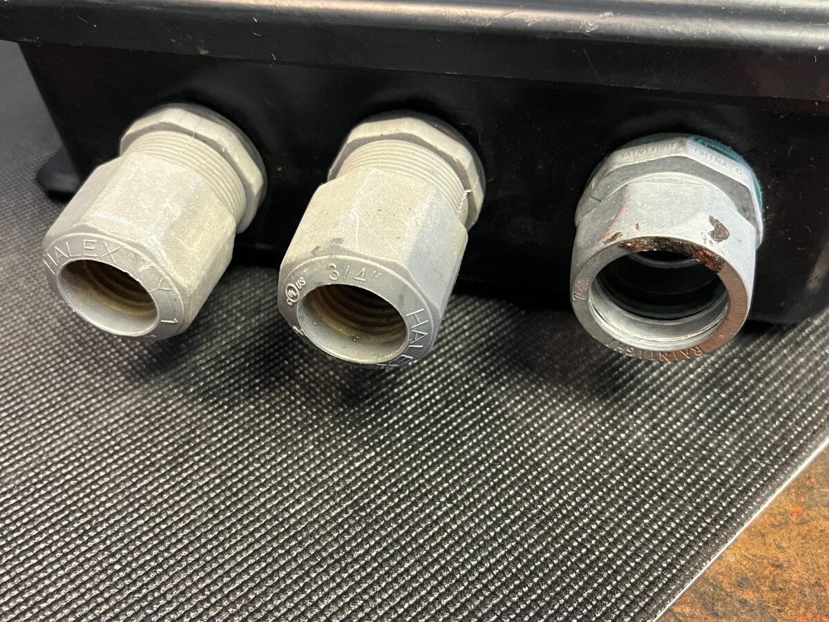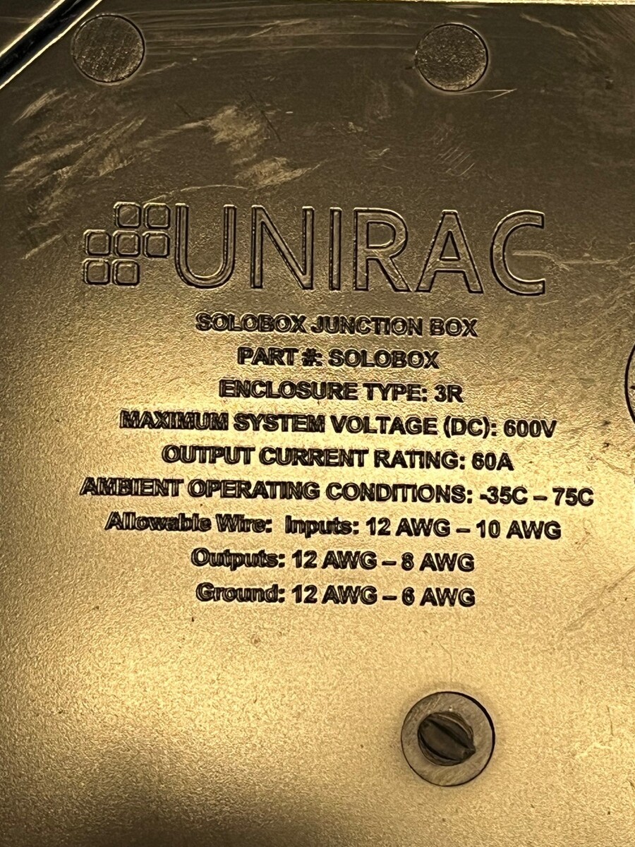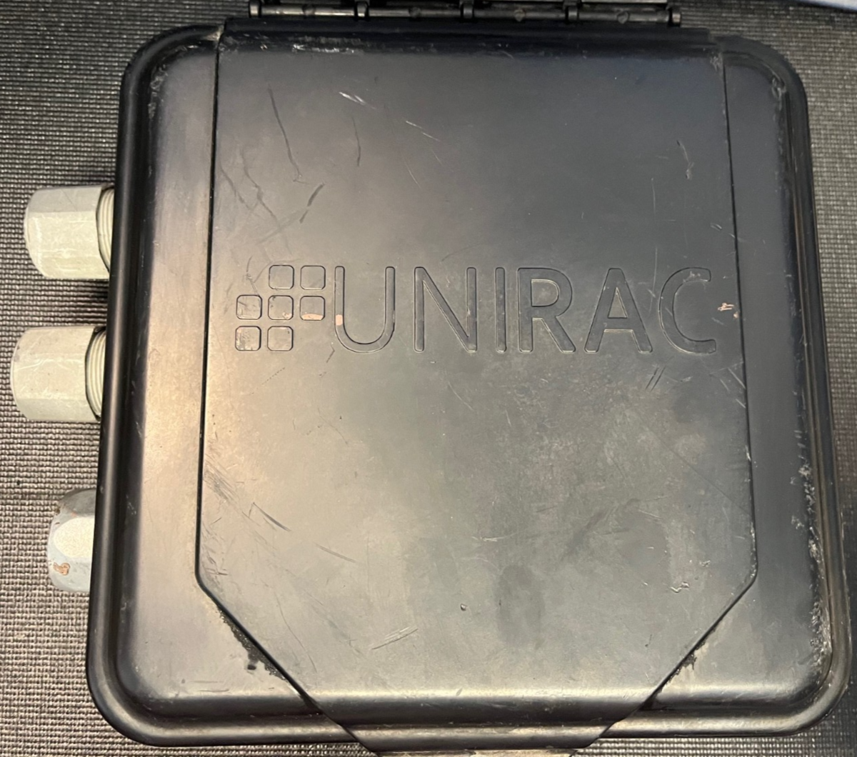 This listing is for a used Unirac Solobox junction box, complete with a pre-installed DIN rail and three included conduit fittings: one Halex 3/4" Y 2, one Halex 3/4" Y 1, and one Rain Tight 7 threaded connector. The Solobox features a NEMA 3R enclosure for weather resistance, flexible conduit entry points on all sides, and easy installation for solar or electrical projects.