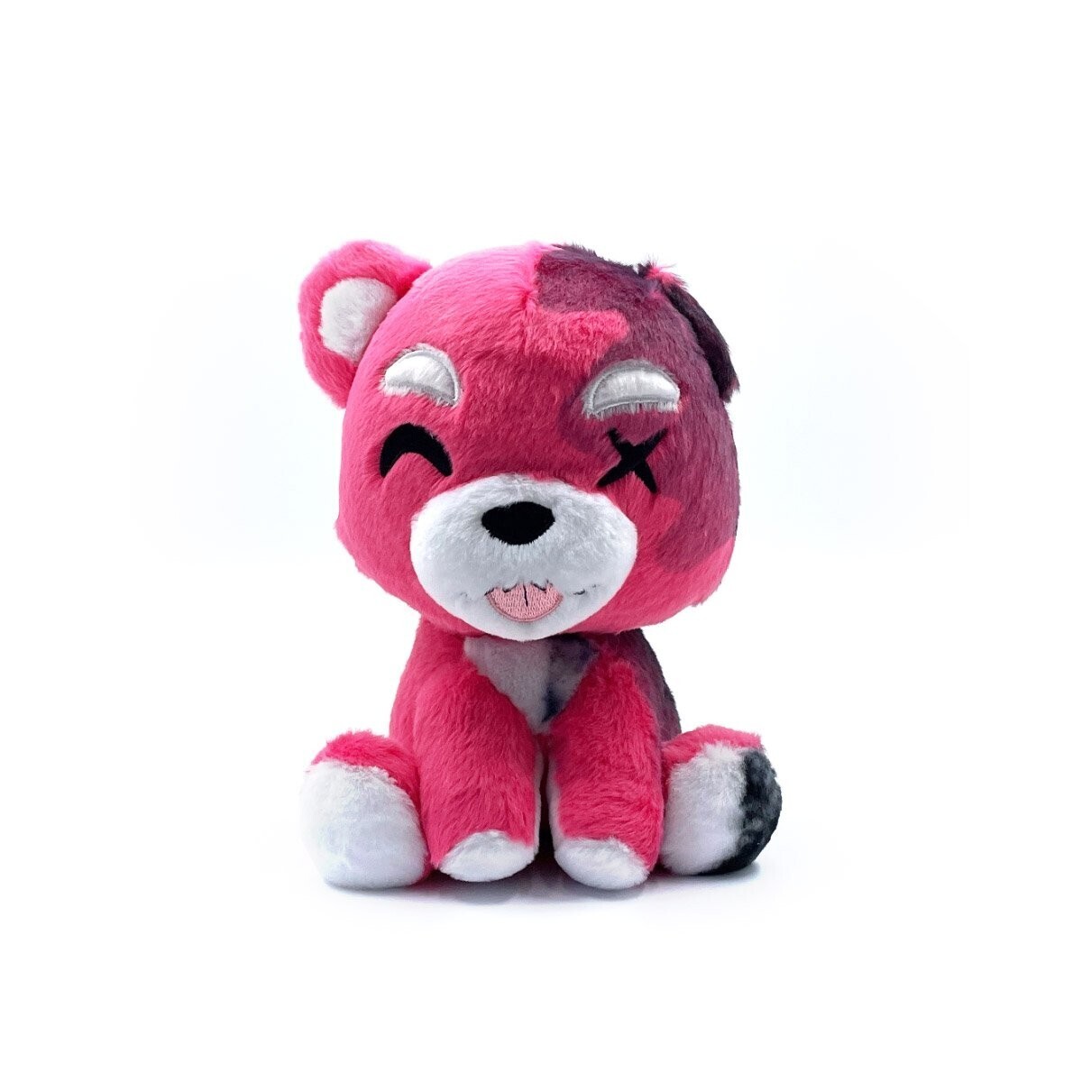 This bear... is so cute... and so burnt. Sitting at 9 inches, this bright pink bear has it's tongue peeking out slightly from it's mouth. A mlem, if you will. The left side of this bear a little torched, while the right side looks regular. It's left eye is an embroidered "X" while the right eye is the signature Youtooz eye. It's left ear is non-existent, as it seems it has been burned off. This plush is made out of faux fur material and is generously filled with stuffing.