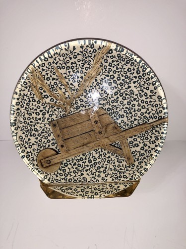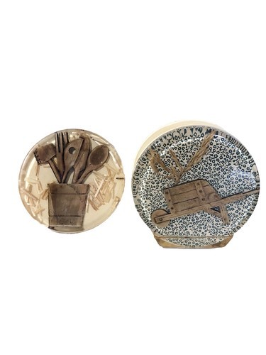 This vintage Lucite wheelbarrow napkin holder and kitchen utensil trivet set is a charming addition to any farmhouse or cabin decor. The rustic multicolor design, featuring a whimsical wheelbarrow and wheat design and adds a touch of country style to your kitchen. Made of durable Lucite material and measuring 5.5 inches in diameter and 5.75 inches in height, this original set of two is perfect for all occasions. Display your napkins and set your hot pot on the trivet with a touch of retro flair from the 1970s.