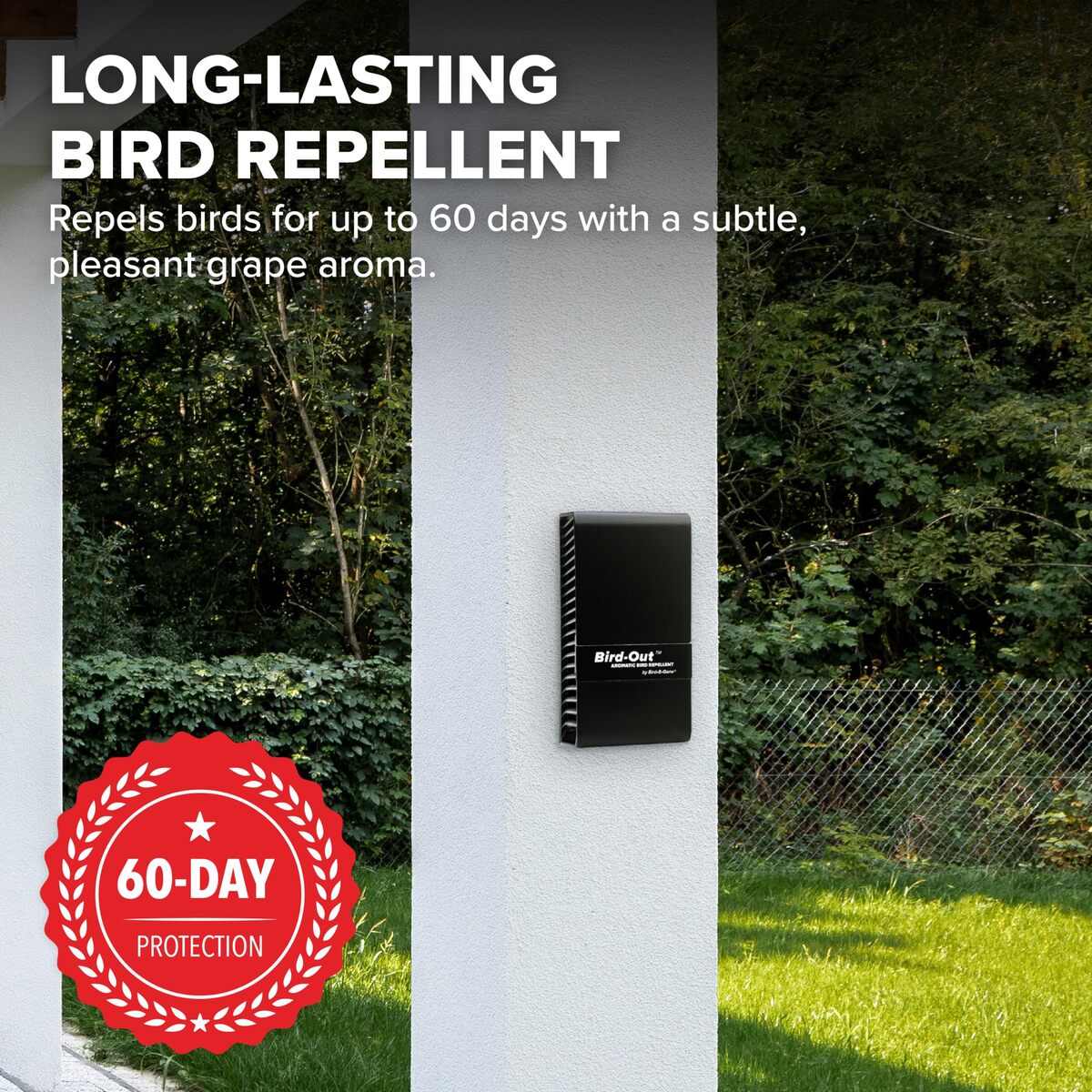 Bullet point: POWERFUL AROMATIC REPELLENT: Bird B Gone?s Bird-Out is your simple solution to repelling birds from outdoor areas like patios, decks, yards, and much more. Utilizing a food-grade ingredient, Methyl Anthranilate (MA), this discreet dispenser releases a grape scent that birds find intensely repelling yet remains a mild aroma to humans.