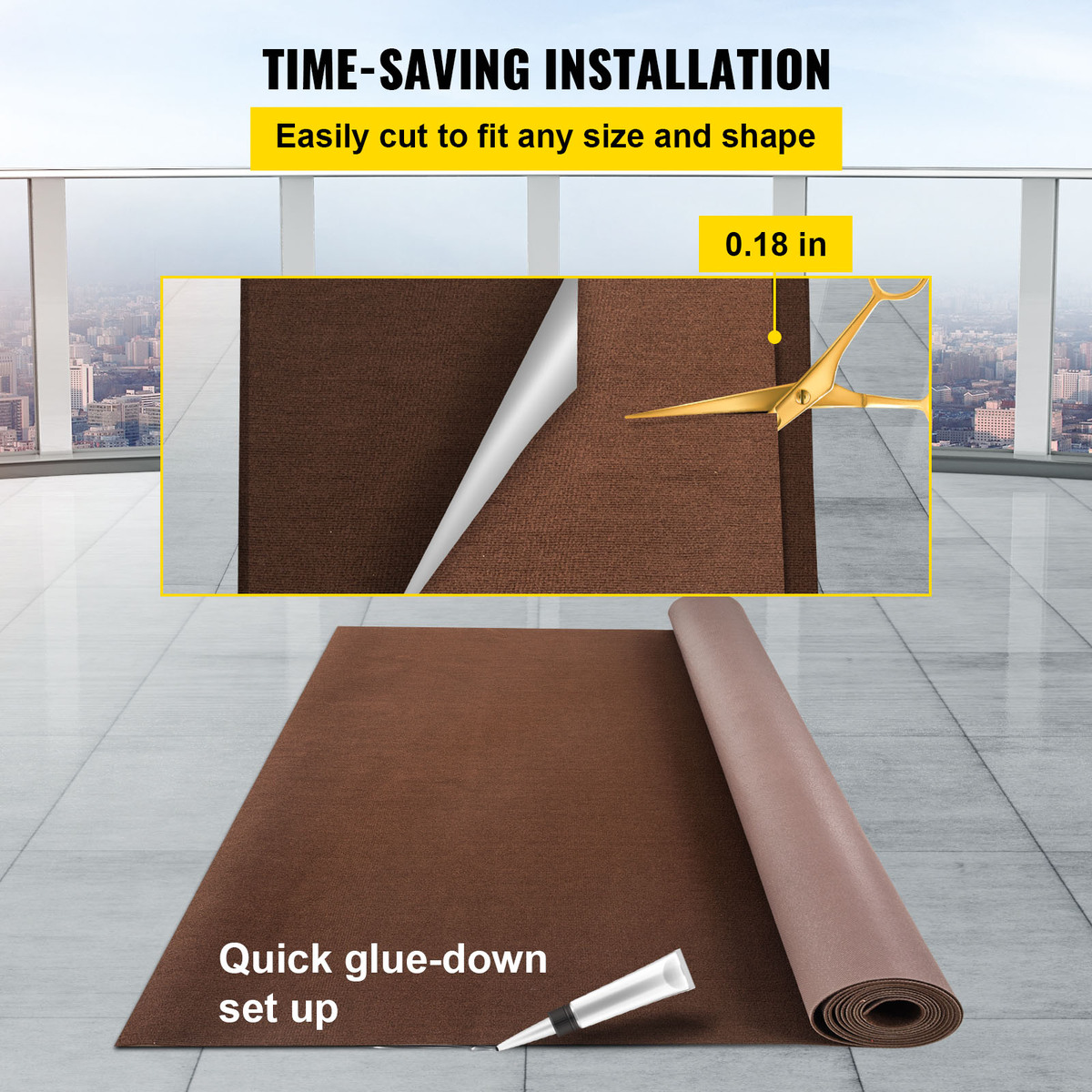 Easy to Clean Install: This marine carpeting is easy to clean with a vacuum machine. Also, easy to sweep or blow debris off. For stubborn stains, you can clean them with rag and carpet cleaner. Thanks to its 0.18 in(4.6 mm) thick, the carpet can be cut easily with scissors or a utility knife and leaves no fuzz, shaping it into any size to fit any spaceโa time-saving glue-down setup.