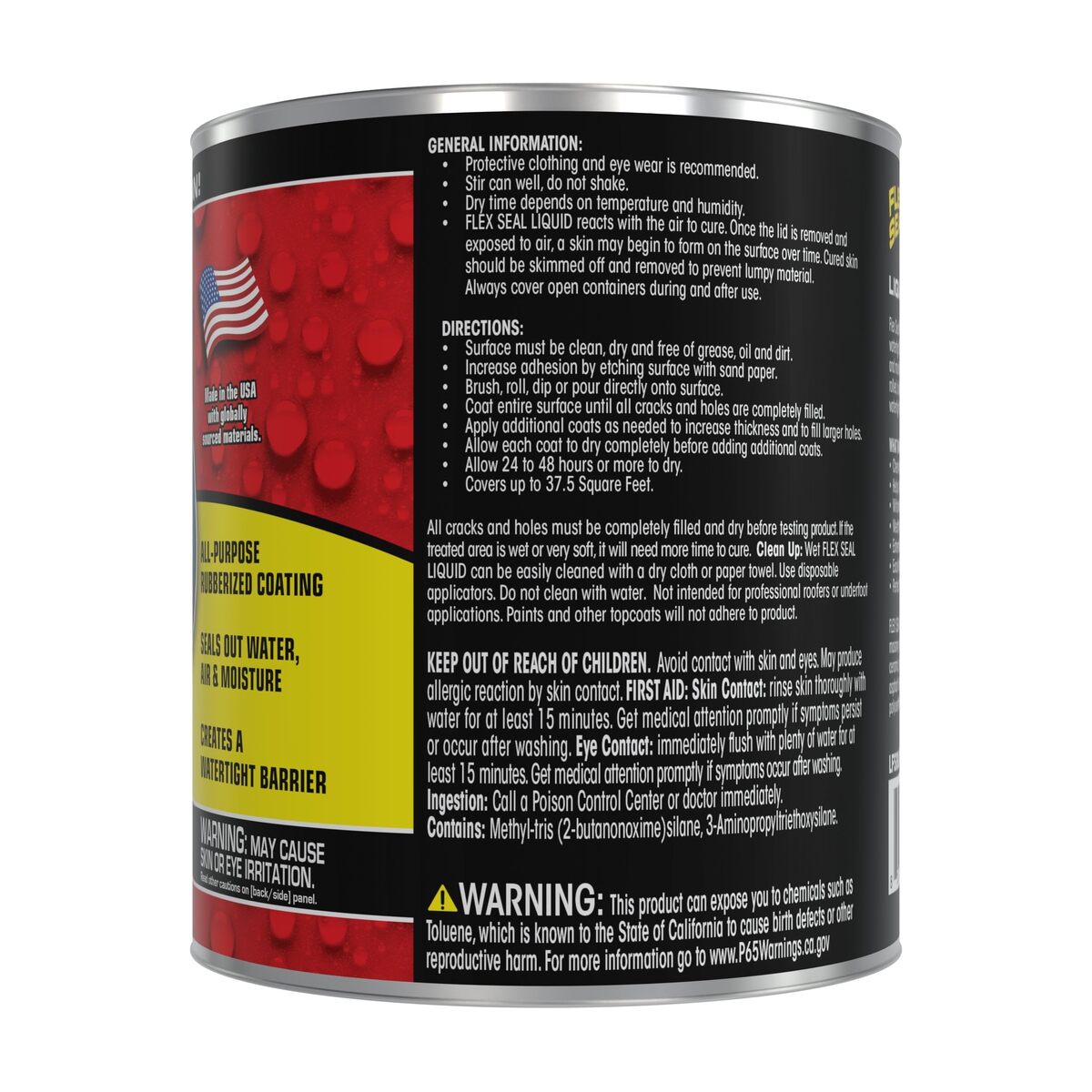 Product description: FLEX SEAL LIQUID is a thick rubberized liquid that you can brush, roll, dip or pour. It starts out as a thick liquid and dries to a strong, flexible, watertight, rubberized coating. Seals out air, water and moisture and is chemical and UV resistant. Available in black, white, clear and gray. Flex Seal Liquid is perfect for: Concrete and asphalt repair, Foundation repair and preventing basement seepage, Weatherizing and sealing out moisture, Home and roof repair, RV and motorhome weatherizing and repair, Pools and pool equipment, and so much more! Flex Seal Liquid works on: Concrete, glass, brick, stucco, masonry, wood, copper, plastic, tile, fabrics, wires, vinyl, fiberglass, ceramic, porcelain, metal, aluminum, natural stones, foam, asphalt, EIFS, TPO, PVC, EPDM, CSPE, Hypalon polyurethanes and more.