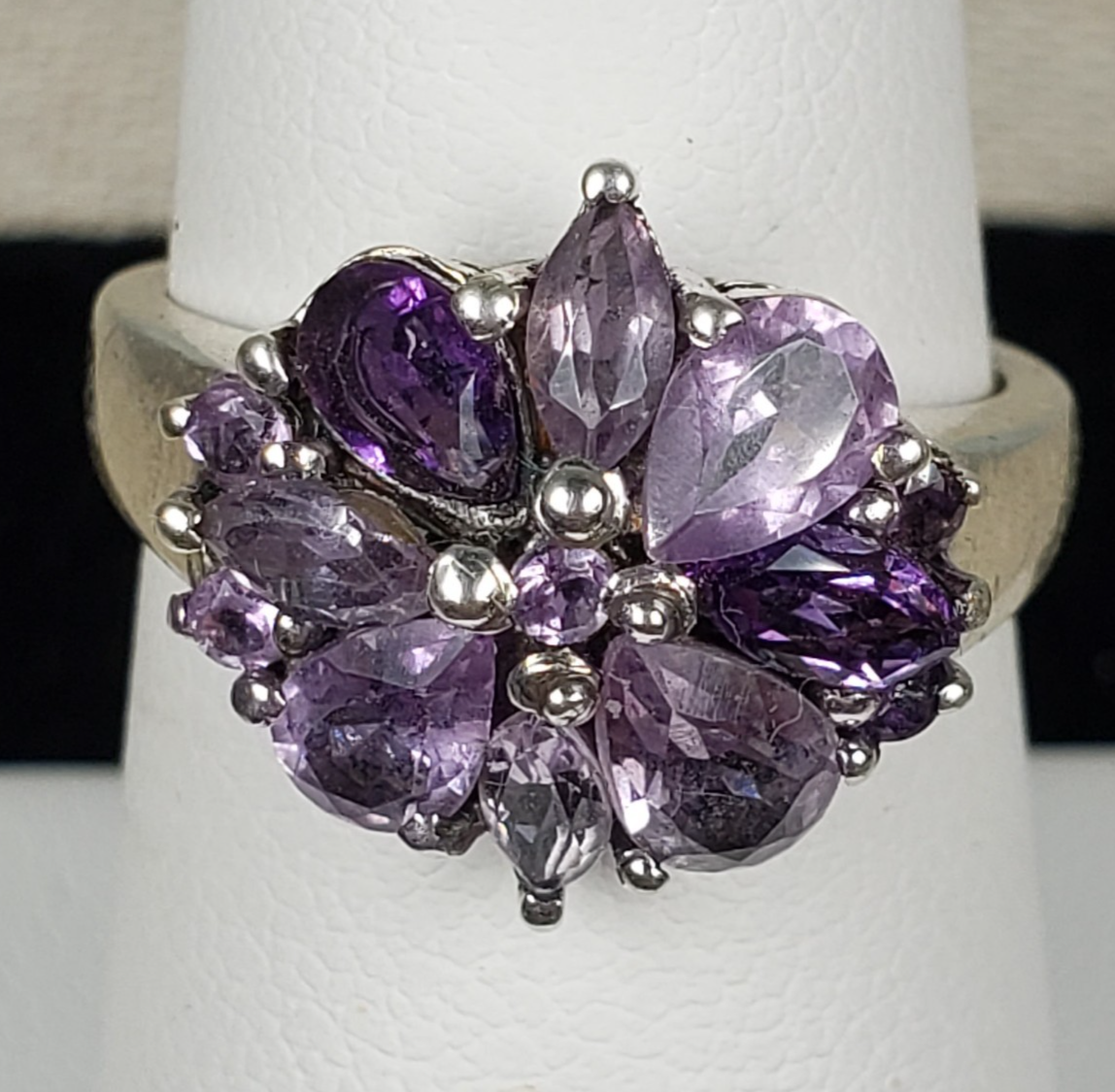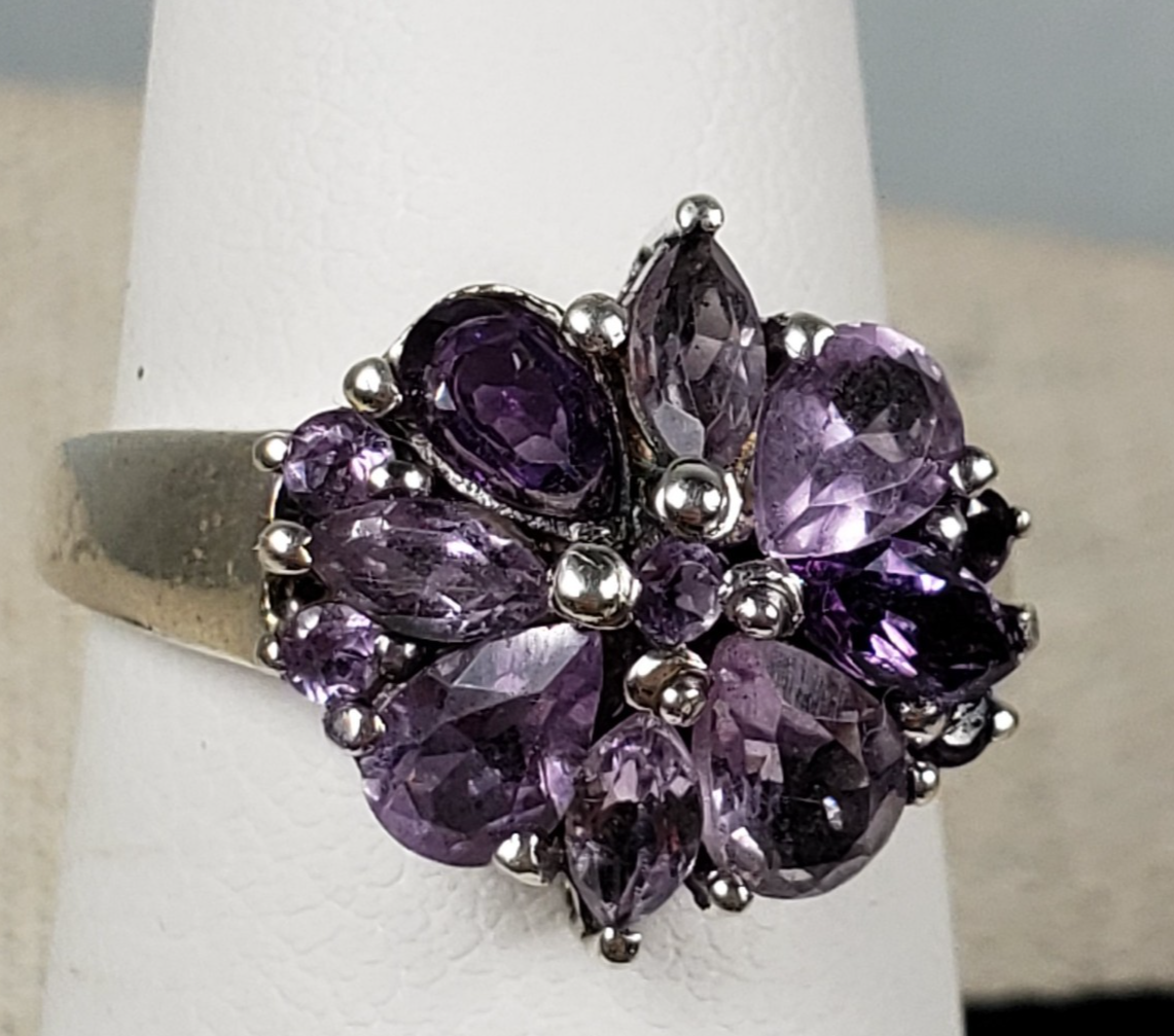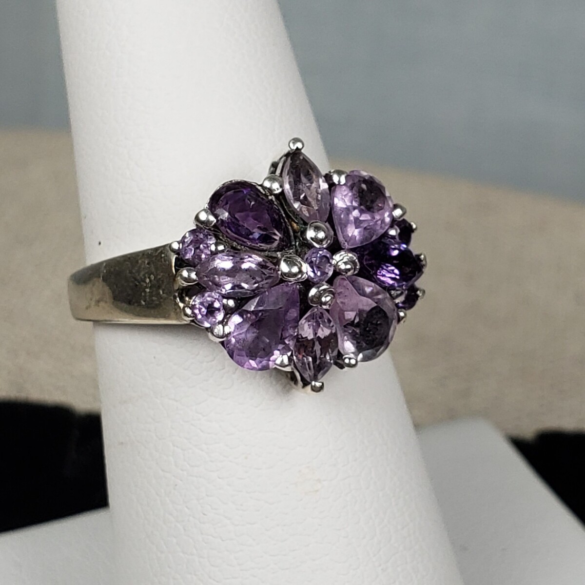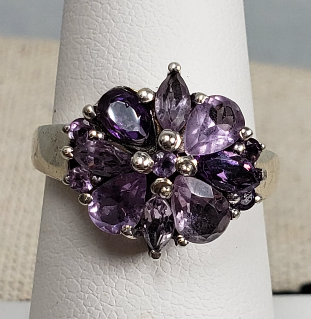 Vintage Purple Amethyst Flower Cocktail Ring 925 Sterling Silver Size 7 Pear Marquise Round Stone Shapes
