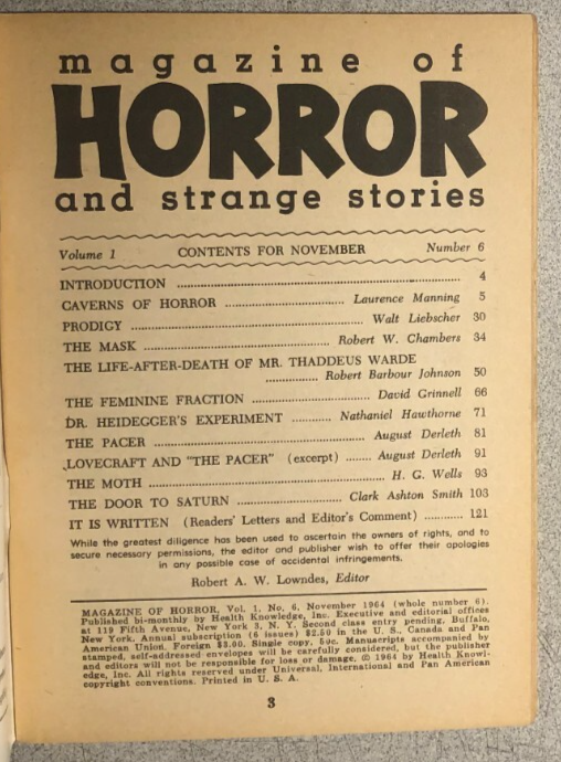 MAGAZINE OF HORROR #6 digest magazine 1964 Clark Ashton Smith Derleth H.G. Wells