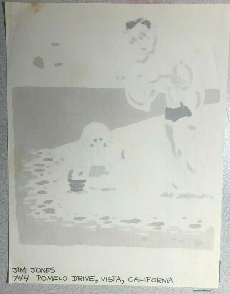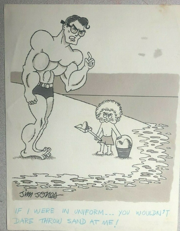 This item is from the archives of Jim Jones? personal studio, which was recently purchased from his estate. Born in 1928, Jim Jones was a prolific creator in the comic book field. He worked for (and with) Harvey Kurtzman, Ron Wilber, R.C. Harvey and many others that were also close friends. Although he did not reach the prominence of some of his contemporaries, he was well known and respected in illustrator and creator circles, and his work was published frequently in numerous fanzines such as RBCC, The Collector, Fantasy Illustrated, Alter Ego, Batmania, ERBdom and more. His professional work appeared in Playboy, Adam, Sir, Mad, Cracked, Trump, National Lampoon, Help!, Fantastic Monsters, Esquire, Sick and many other magazines! Several of his series were self-published with very limited print runs. Among the voluminous contents of his archives were many pieces of production art, many original finished pieces, hundreds of sketches, and multiple copies of prints (most on plain paper) that he produced.