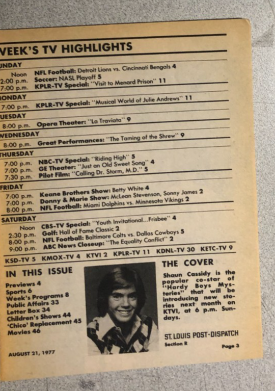 TV MAGAZINE St Louis (MO) Post-Dispatch August 21 1977 Shaun Cassidy cover
