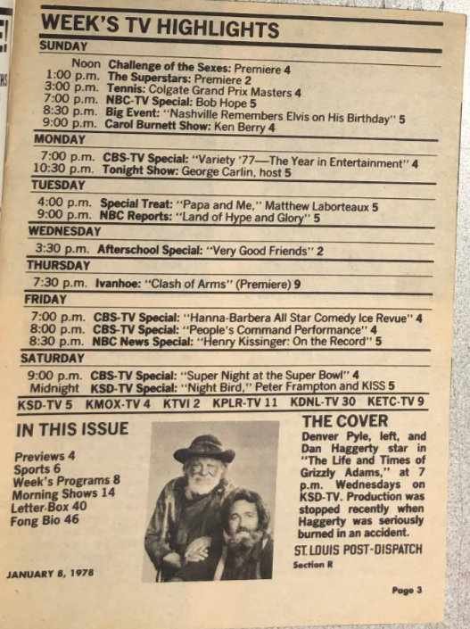 TV MAGAZINE St Louis (MO) Post-Dispatch January 8 1978 Dan Haggerty cover
