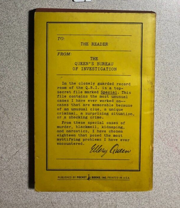 Q.B.I. 18 short stories by Ellery Queen (1965) Pocket Books mystery paperback