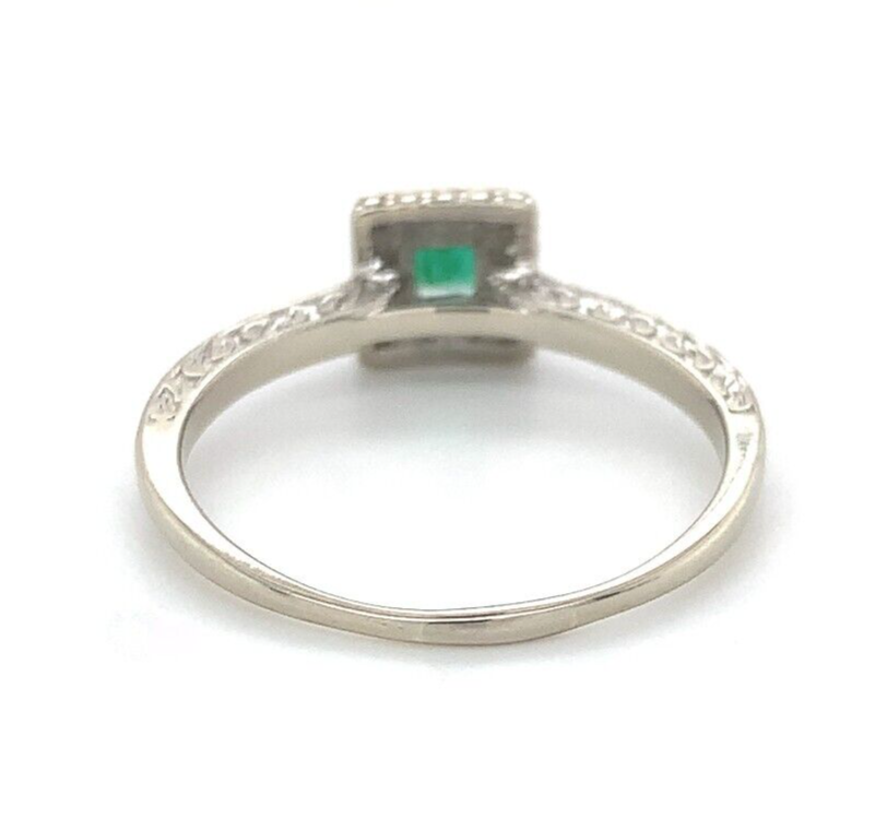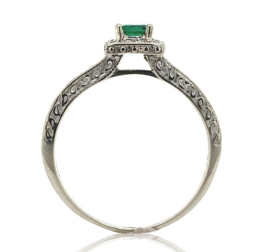 10K white gold emerald and diamond ring. The earth mined square step cut emerald has bright grass green color. It measures about 3.5mm and weighs .19ct. There are twelve small round diamond accents measuring about 1.4mm. There is a scrollwork pattern on three sides of the band almost 1/2 way around the ring.
