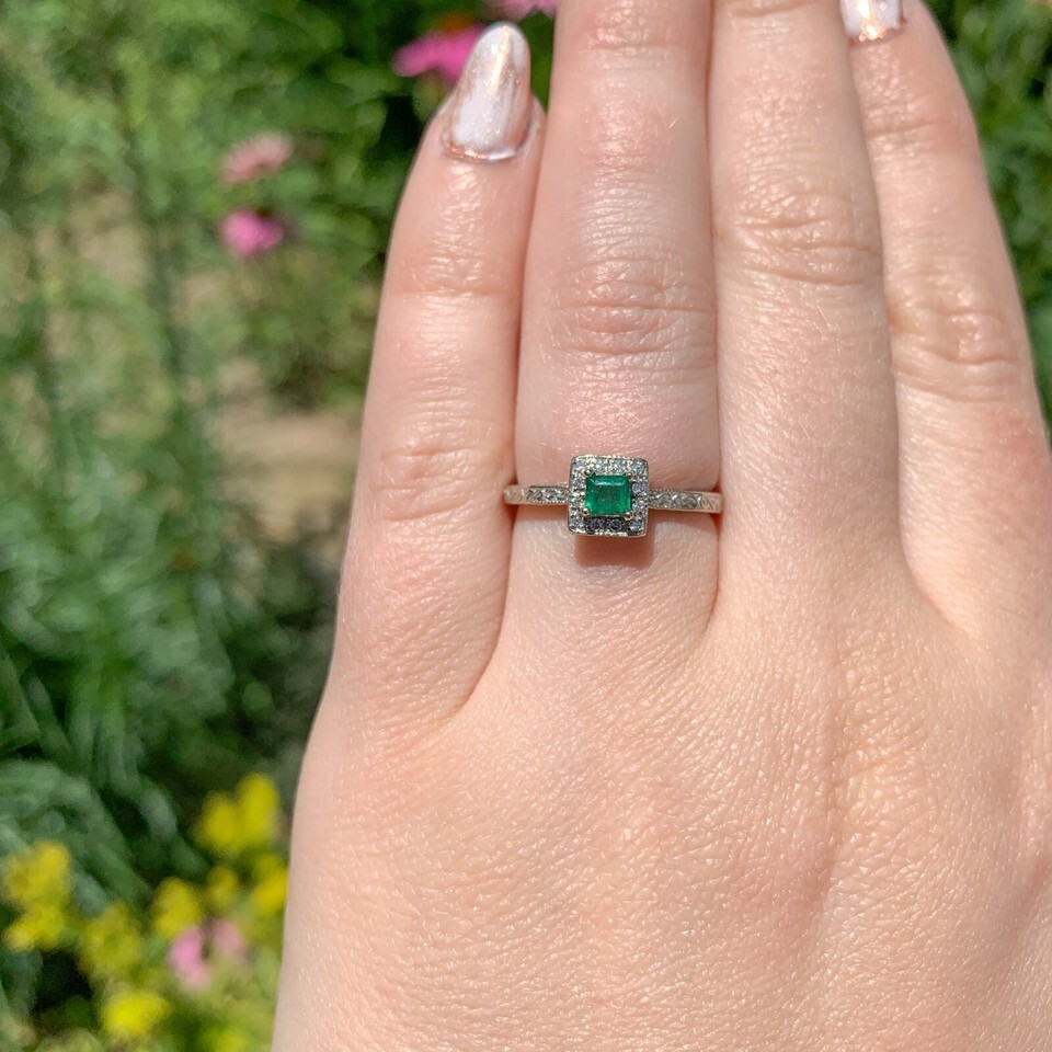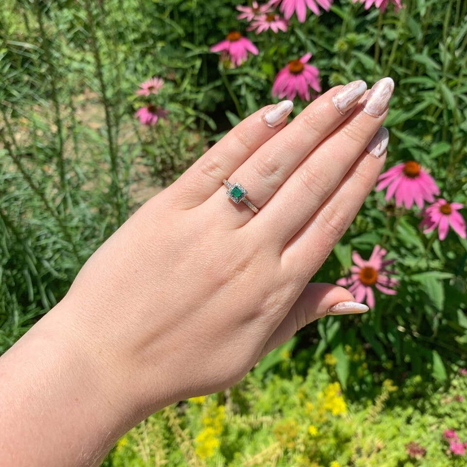 10k White Gold Genuine Natural Emerald Ring with Diamond Halo Size 6.5 (#J6808)