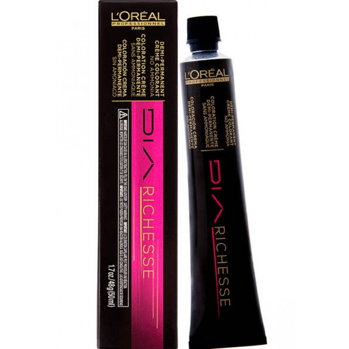 L'Oreal Professionnel DIA Richesse Ammonia-Free Demi-Permanent Gel-Creme Haircolor is the first acidic tone-on-tone color that creates glossy luminous looking reflects and vinyl shine whilst respecting the condition with natural-looking color that gradually fades away. Ideal for previously colored or weakened hair or even for those that just want to add a subtle richness or gloss to their natural hair color. DIA Light is great for offering a color refresh to top up the vibrancy of your color in between your usual permanent color services. Fast development also makes it ideal for those with busy lives and who are short of time. With the technology of DIA Light, your hairdresser will be able to create a truly personalized color, tailored to you. ATTENTION: This product requires professional expertise. The seller is not liable for any adverse outcome resulting from the use of this product. Made In Canada. Majirel Usage Guide Levels of lift - Up to 2-3 levels Coverage of white - Up to 100% Developer - 20, 30, and 40 Volume Majicreme Mixing - 1 tube + 2.62oz. Majicreme developer Development time - 35 to 45 min Apply the mixture to the re-growth and re-apply to mid-lengths and ends Develop for full development time. 35 to 45 minutes Re-growth Application Apply to dry, unwashed re-growth Develop for full development time. Re-growth application on mid-lengths/ends: Add a small amount of conditioner to the mixture Apply mixture through mid-lengths to the ends. Rinsing When the development time is complete, add a little warm water to the hair and gently emulsify. Thoroughly rinse color from the hair and shampoo lightly with L'Oreal Professionnel Post-Color Shampoo Majirel Mixers Usage Guide Cool Mixers - Control unwanted warmth blue, violet or green mixer For superior control of warmth, add between 1/4 to 1/2 inches ribbon to a Majirel Formula Light Ash Mixer For Extra Control of Warmth on Levels 6 - 9, add between 1-4inches to a Majirel/Majiblond Ultra formula. Warm mixers - intensify and add brightness to warm colors copper, copper-red or red mixer For increased brightness, add 1/4 of a tube to a Majirel formula Note When adding mixers to a formula, no additional developer is needed.