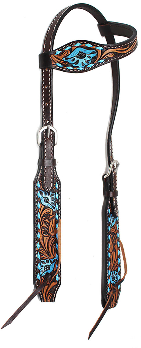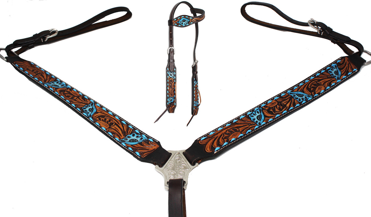 Challenger show tack made from top quality full grain leather. This eye-catching tack set includes a one ear headstall with it's matching breast collar. Beautifully accented with floral tooling and blue laced edges. Features rust-free stainless steel hardware, and tie bit ends.