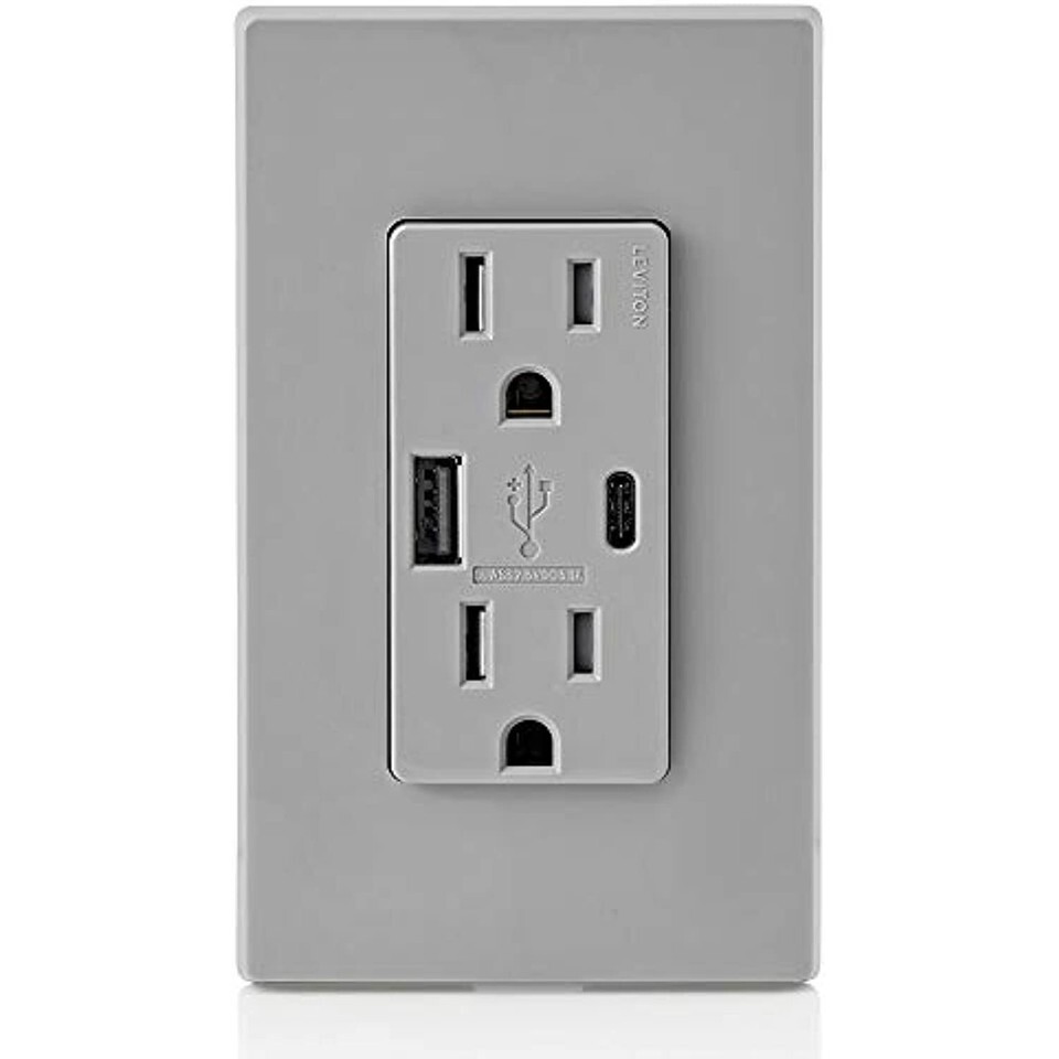 Leviton T5633-GY 15-Amp Type A Type-C USB Charger/Tamper Resistant Outlet, Not for Laptops, Gray
