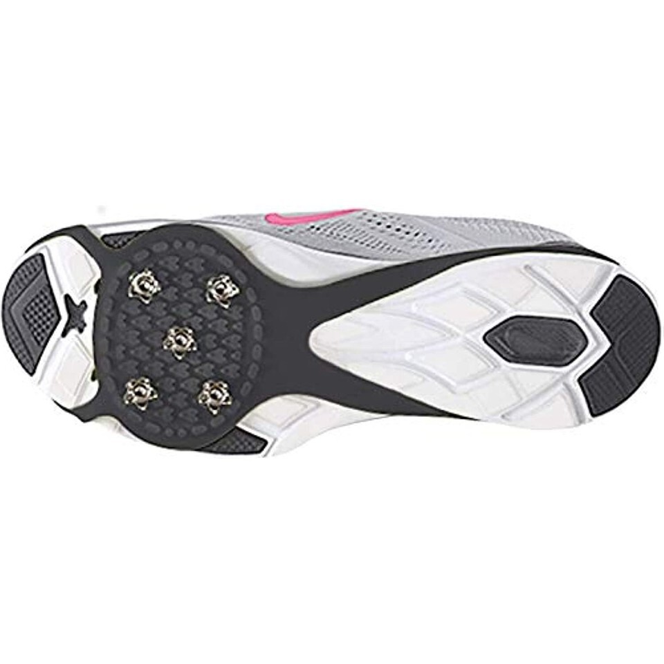 With rubber pads that have (5) 5-pointed steel cleats on each sole.