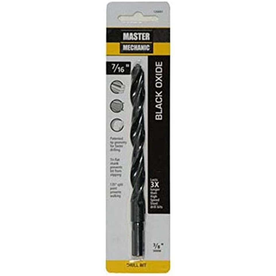 Master Mechanic, 7/16" x 5-1/2", high speed steel BLACK oxide drill bit, jobber length, 3/8" shank, 135 point angle with 4 cutting edges eliminates walking provides fast penetration, BLACK oxide tempering treatment reduces Frictional resistance improves chip flow, recommended for wood, plastic, Wallboard, plywood, soft metals, aluminum, brass bronze, for occasional use in stainless steel other hard metals, Carded.